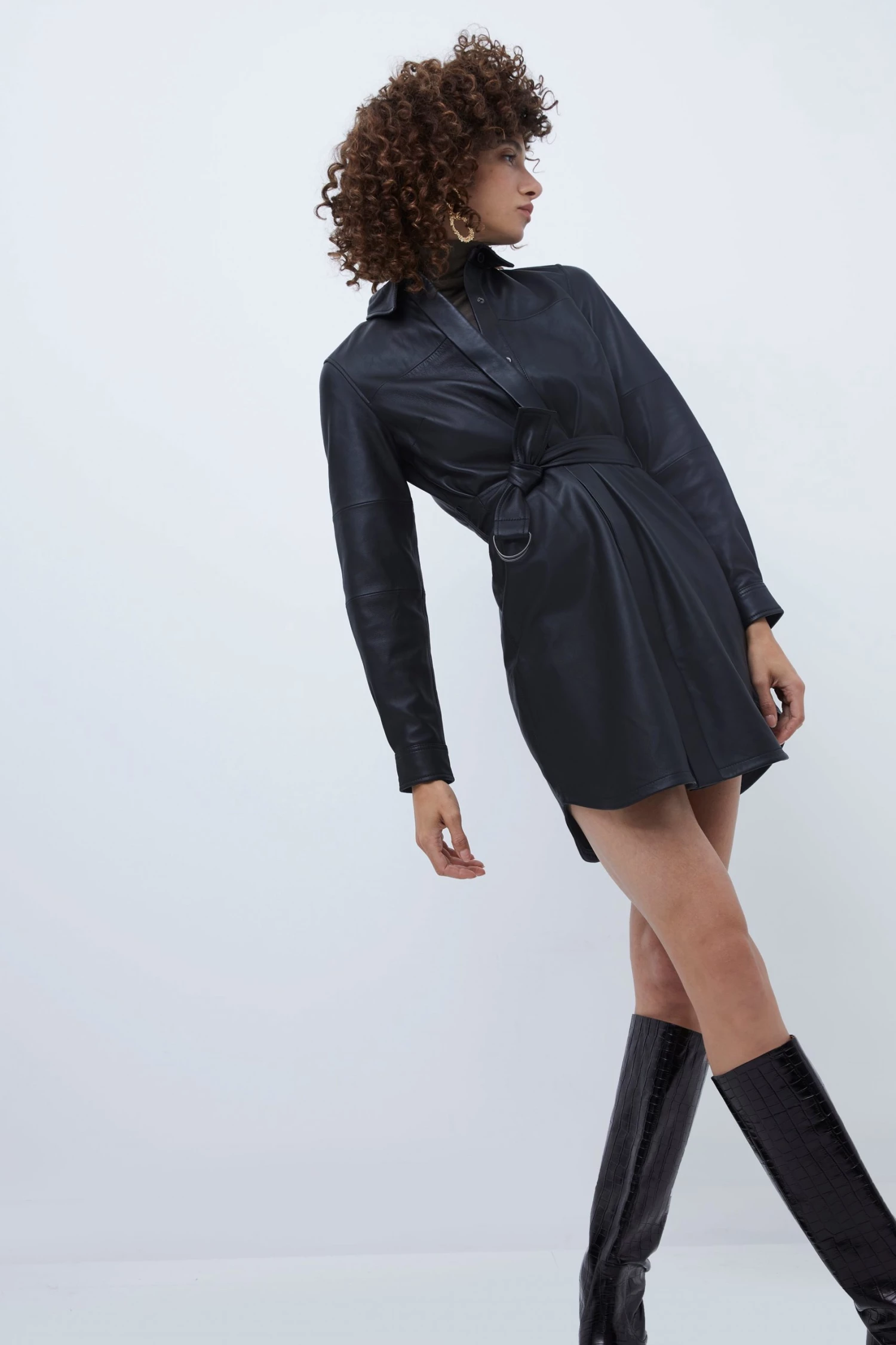 Give your outfit an edgy update with our Patti Leather Dress. Featuring a shirt-style silhouette, it’s designed with a point collar, D-ring belt and mini length.