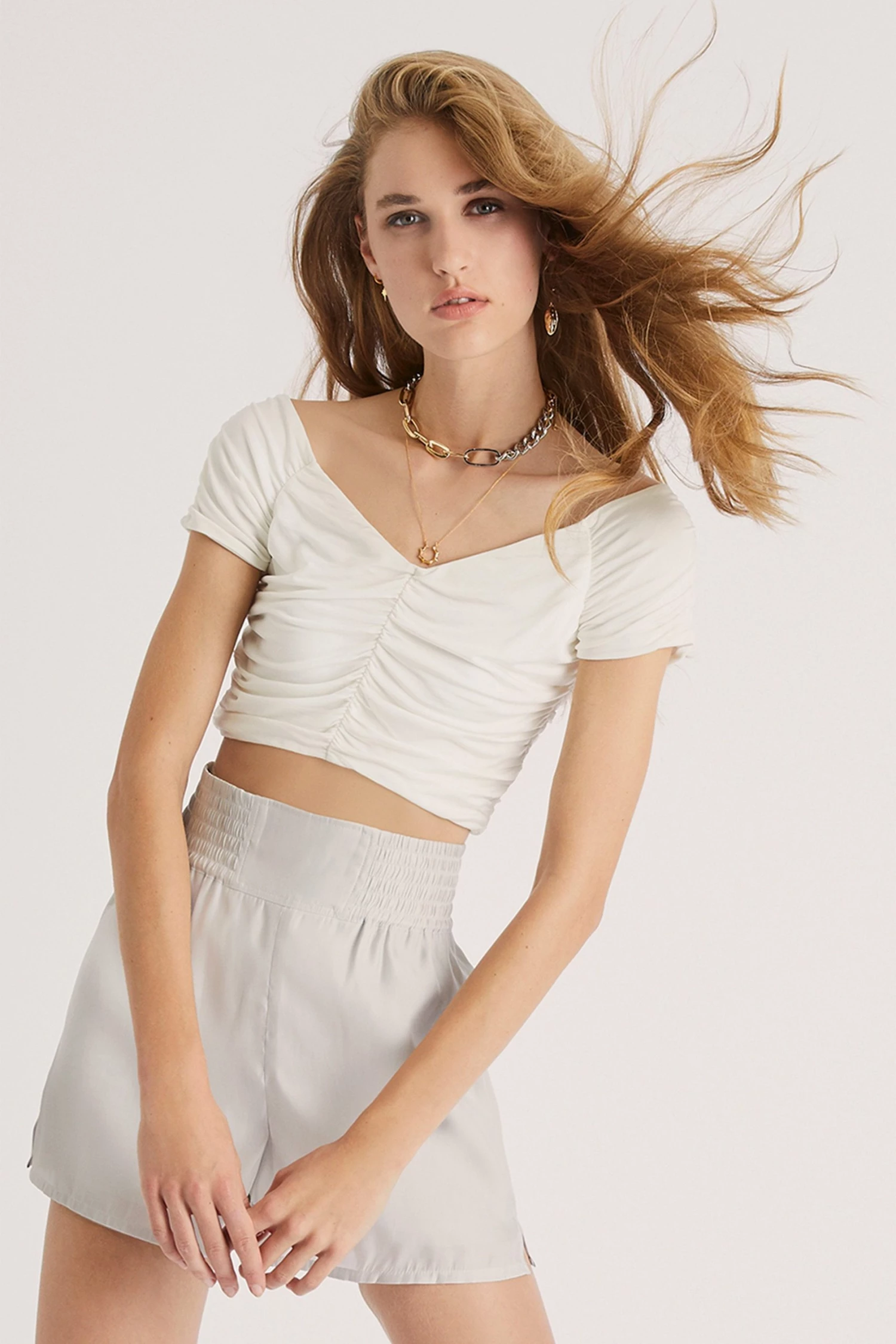 Set to become a perennial favourite, our Piah Off Shoulder Crop Top features a ruched design with short sleeves and is finished with an off-the-shoulder neckline.
