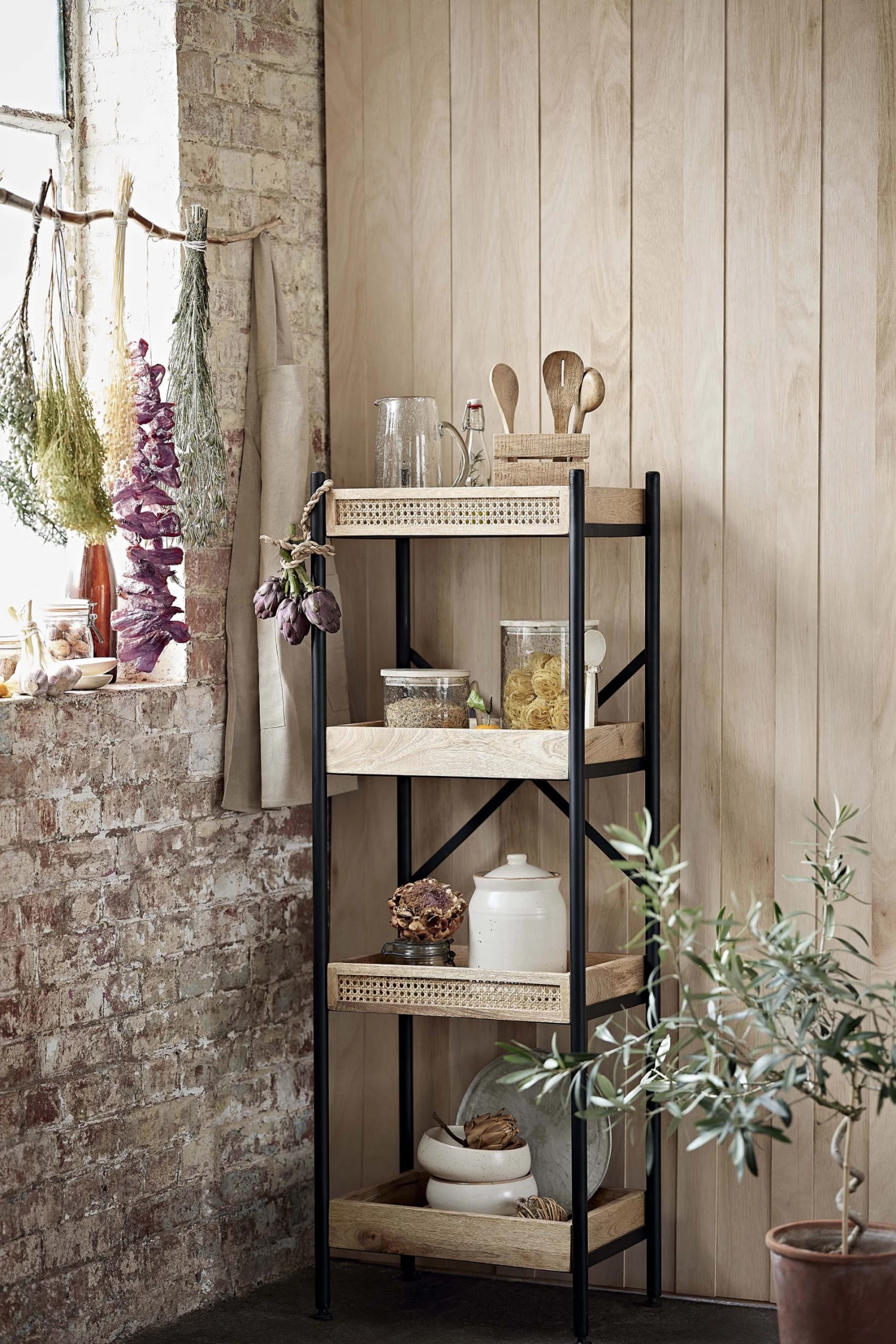 The perfect expansion to your kitchen, the Rattan Pantry Shelf is a sleek storage choice for modern homes. Designed with four wooden shelves and a black metal construction, it’s intricately finished with a rattan trim that adds a bohemian touch while offering a ventilated space for storing fresh produce. Place it in the kitchen or in the pantry and fill with everything from dried goods to kitchen essentials.