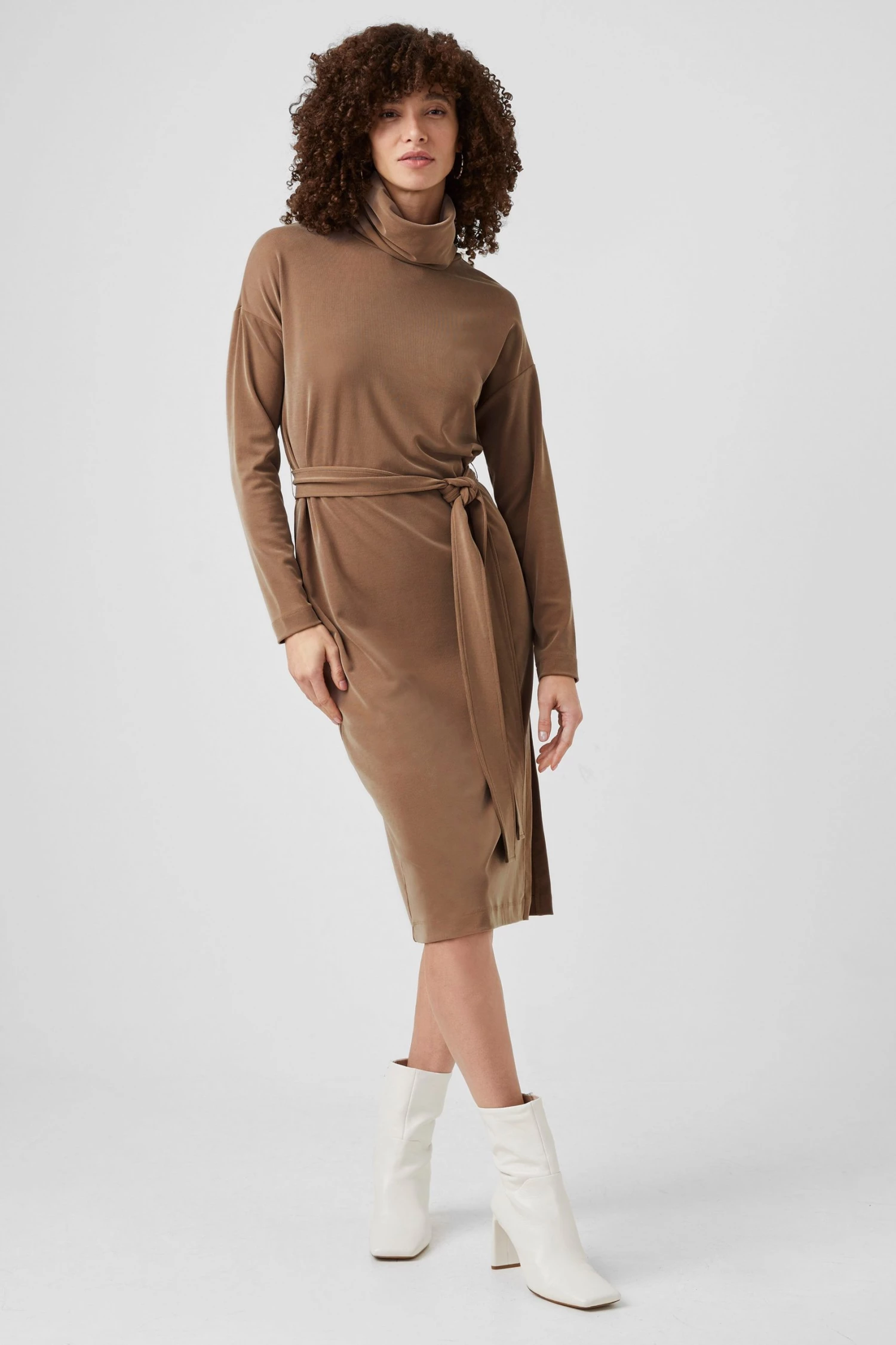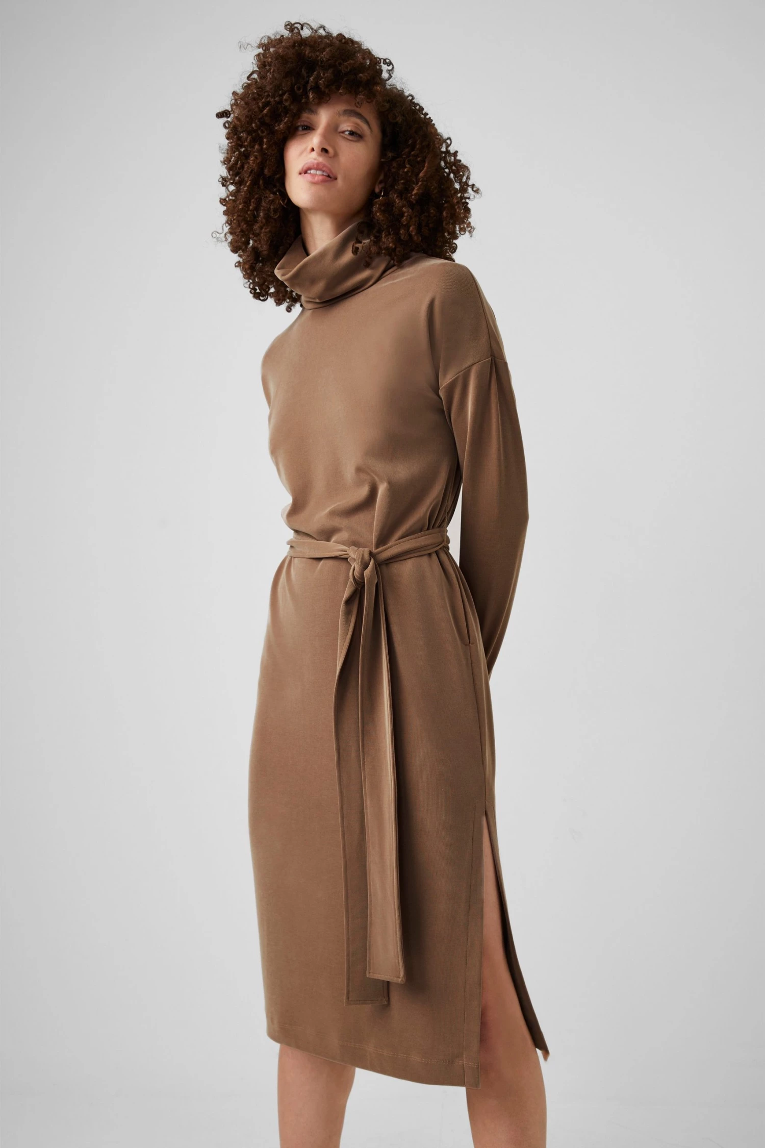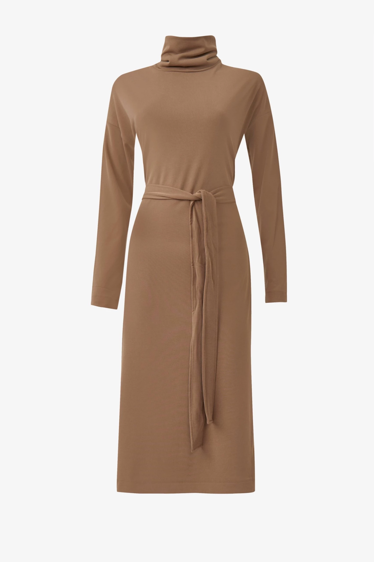 Soft like a cloud yet sophisticated at the same time, the Renji Modal Rollneck Midi Dress has a self-tie belt, comfy rollneck and body-skimming silhouette.