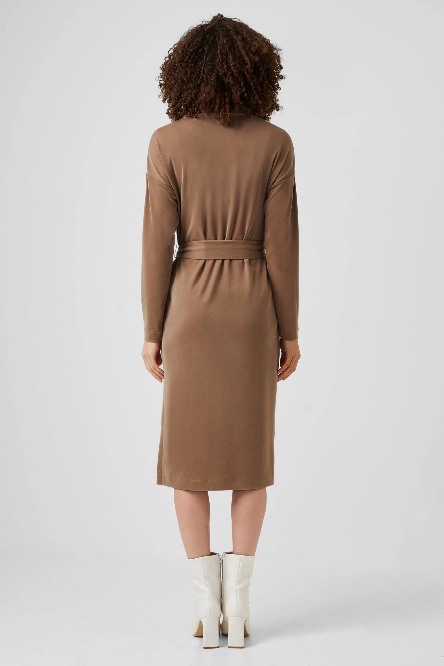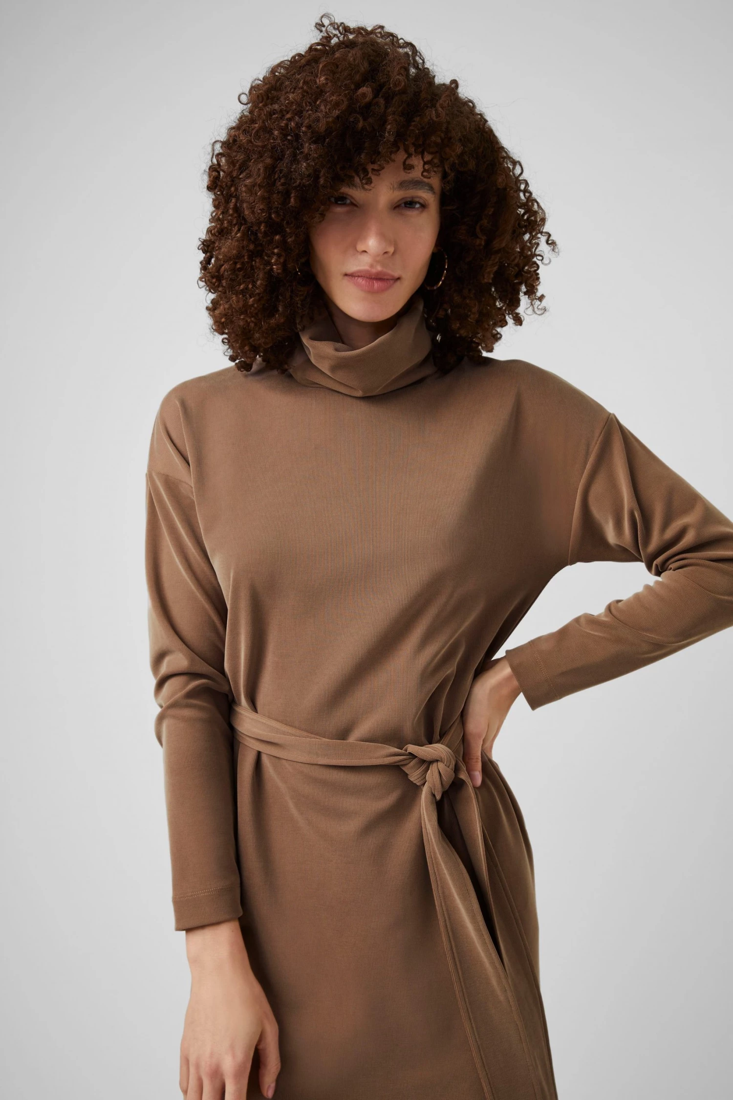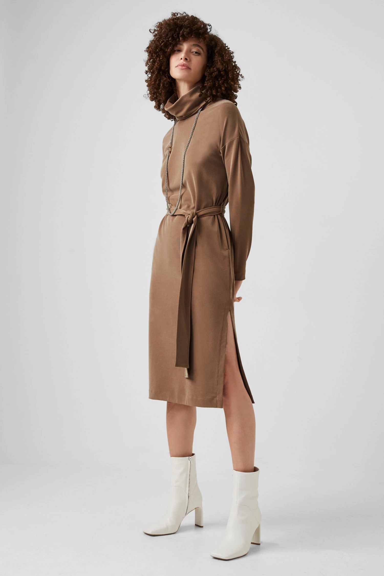 Soft like a cloud yet sophisticated at the same time, the Renji Modal Rollneck Midi Dress has a self-tie belt, comfy rollneck and body-skimming silhouette.