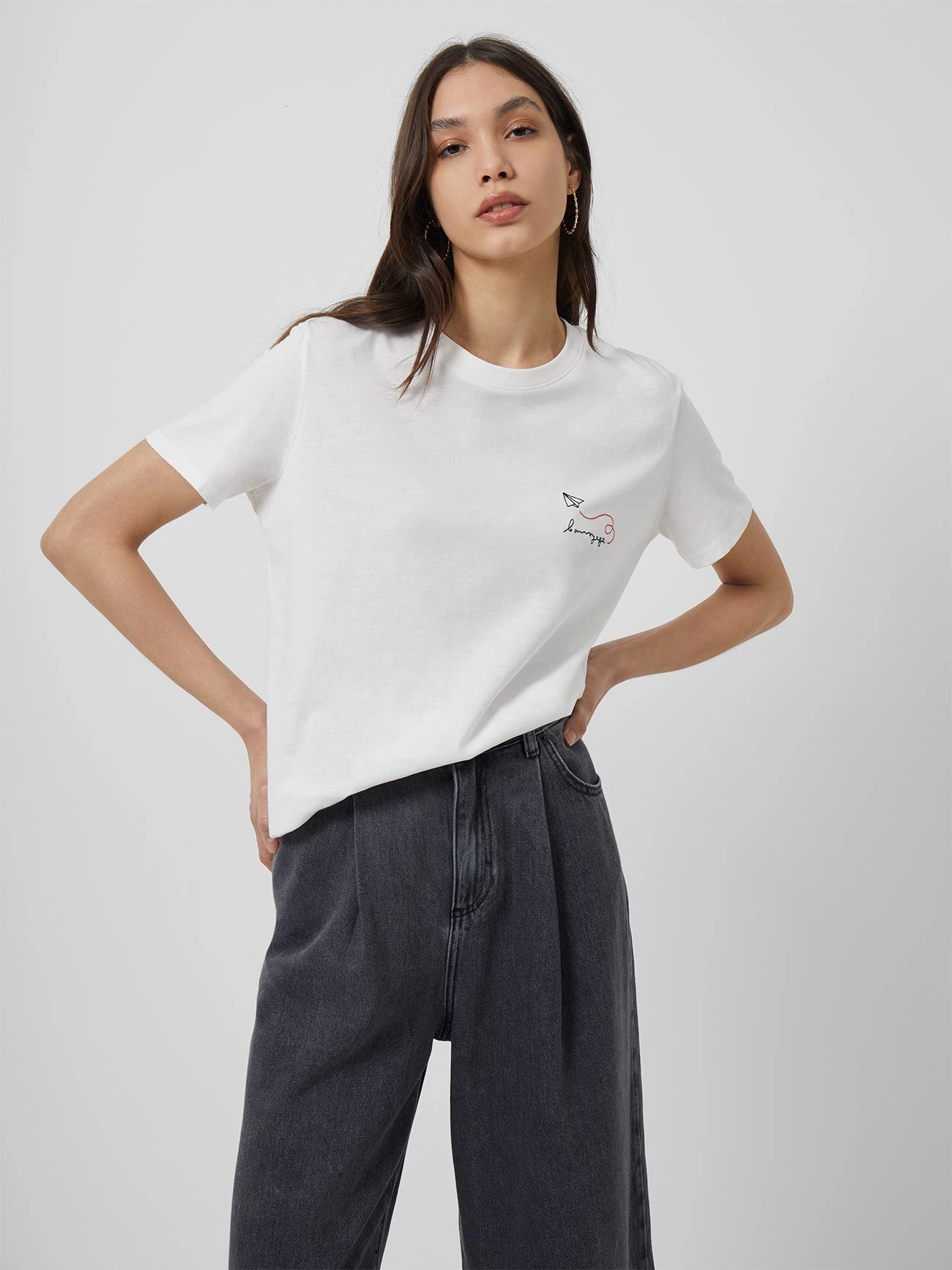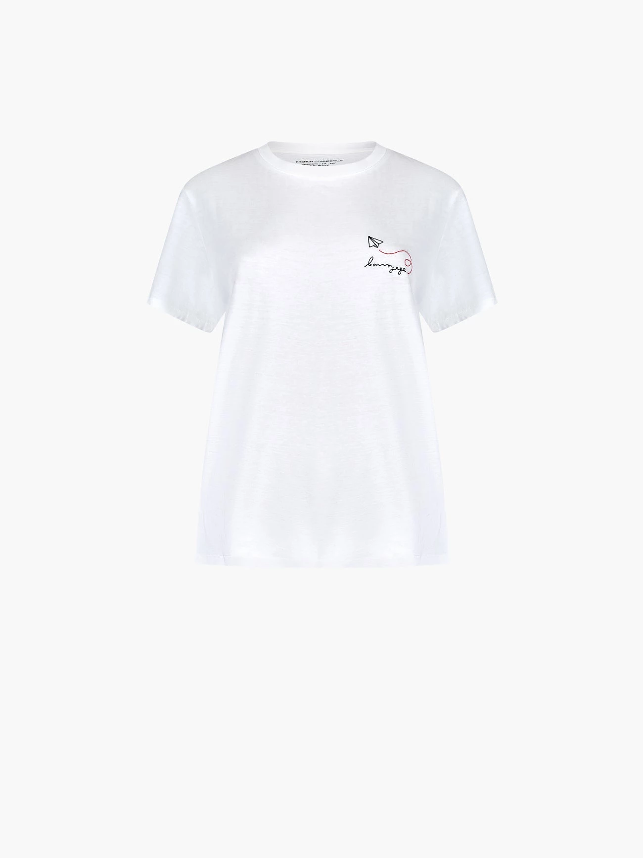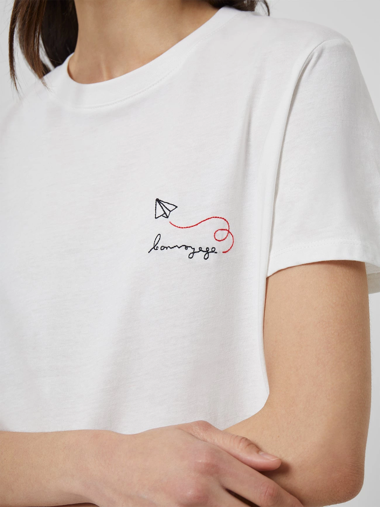 Say goodbye to boring casual wear with the Bon Voyage Embroidered Boyfit T-Shirt. The plain white cotton tee has had an update with charismatic black and red embroidery bringing the joyful ‘bon voyage’ message and paper airplane to life.