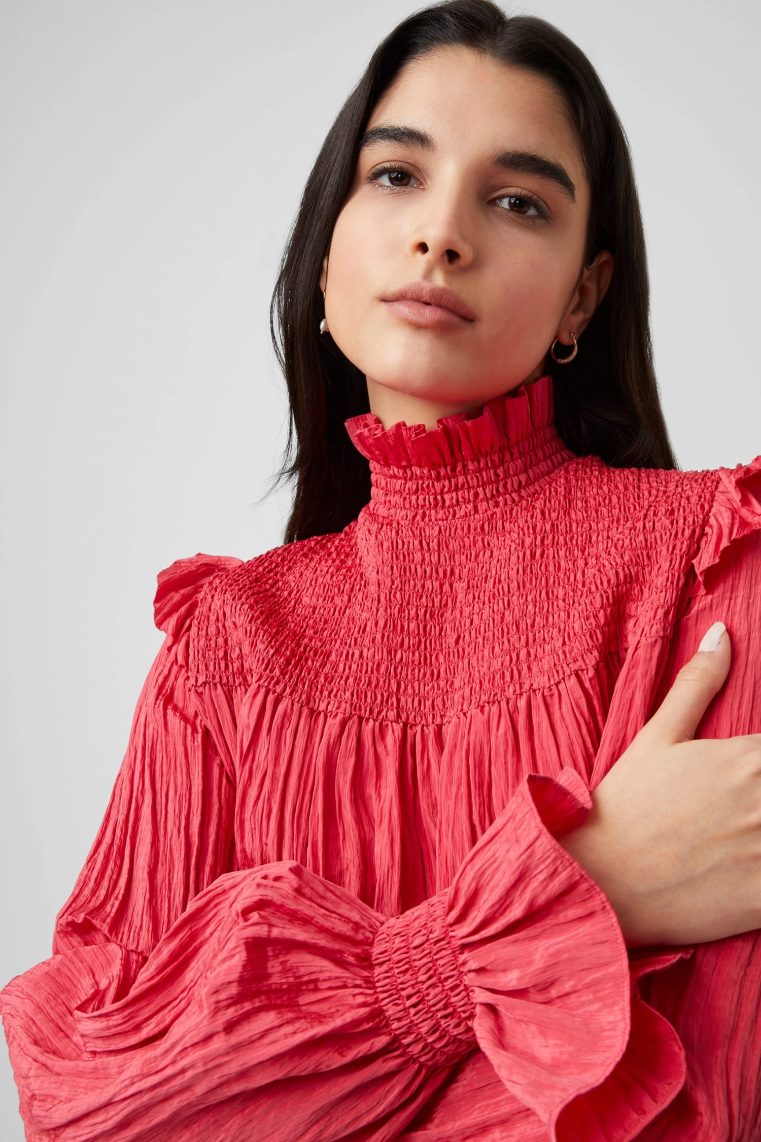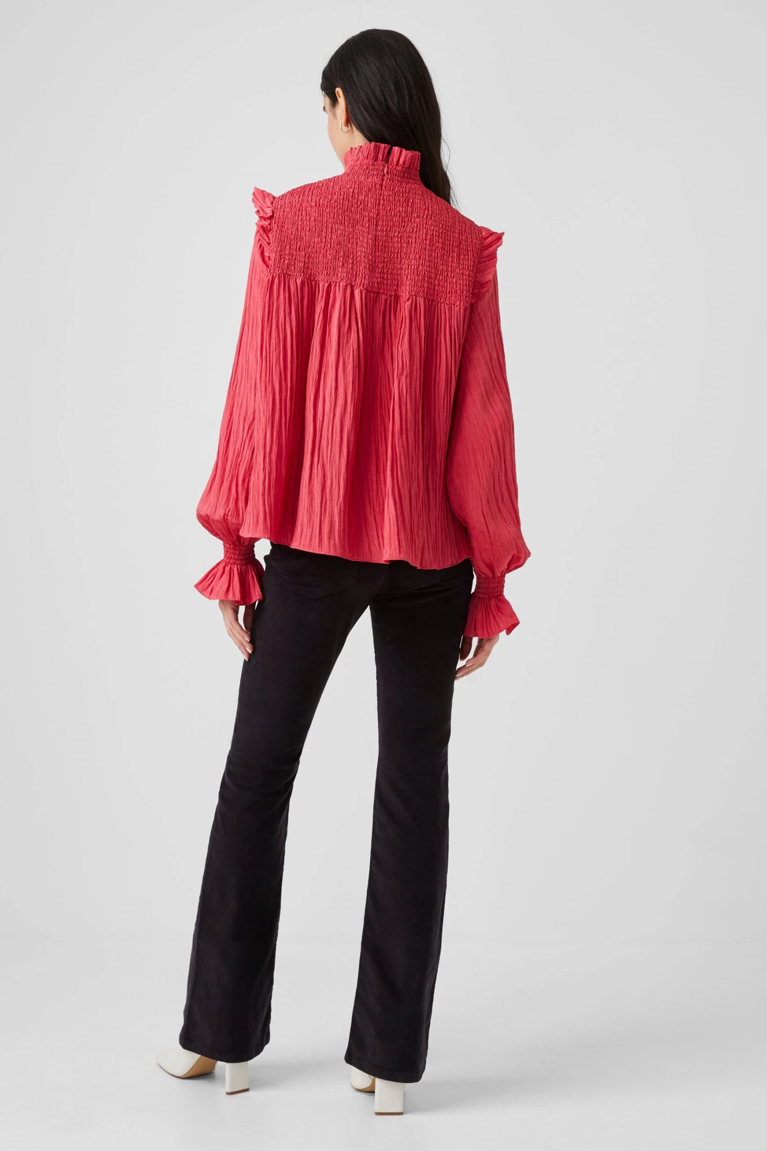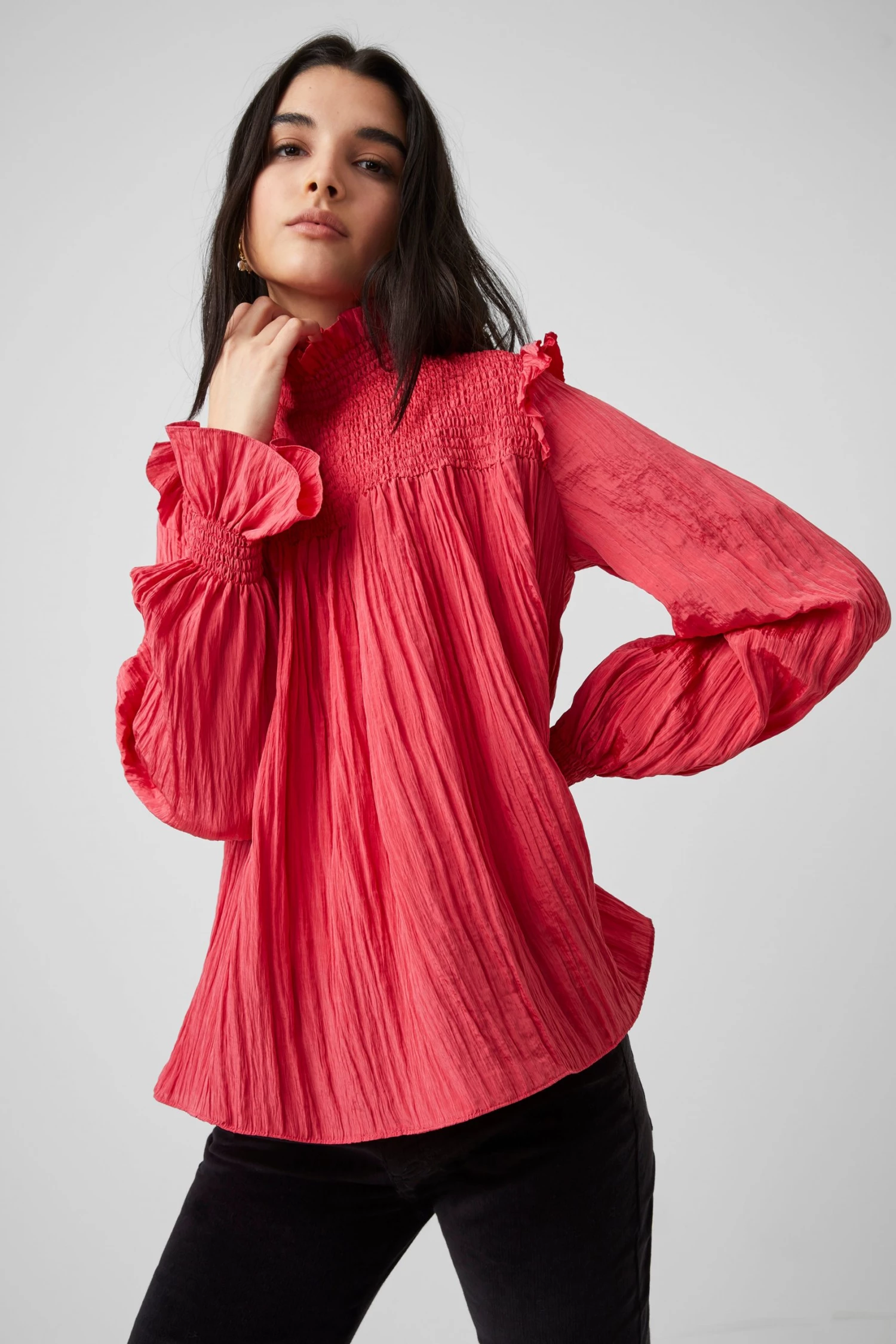 Channel the ever-essential prairie girl look with the Boza Crinkle Smocked Top. In a crisp, crinkle-effect fabric, it’s decorated with ruffled accents and a smocked panel.