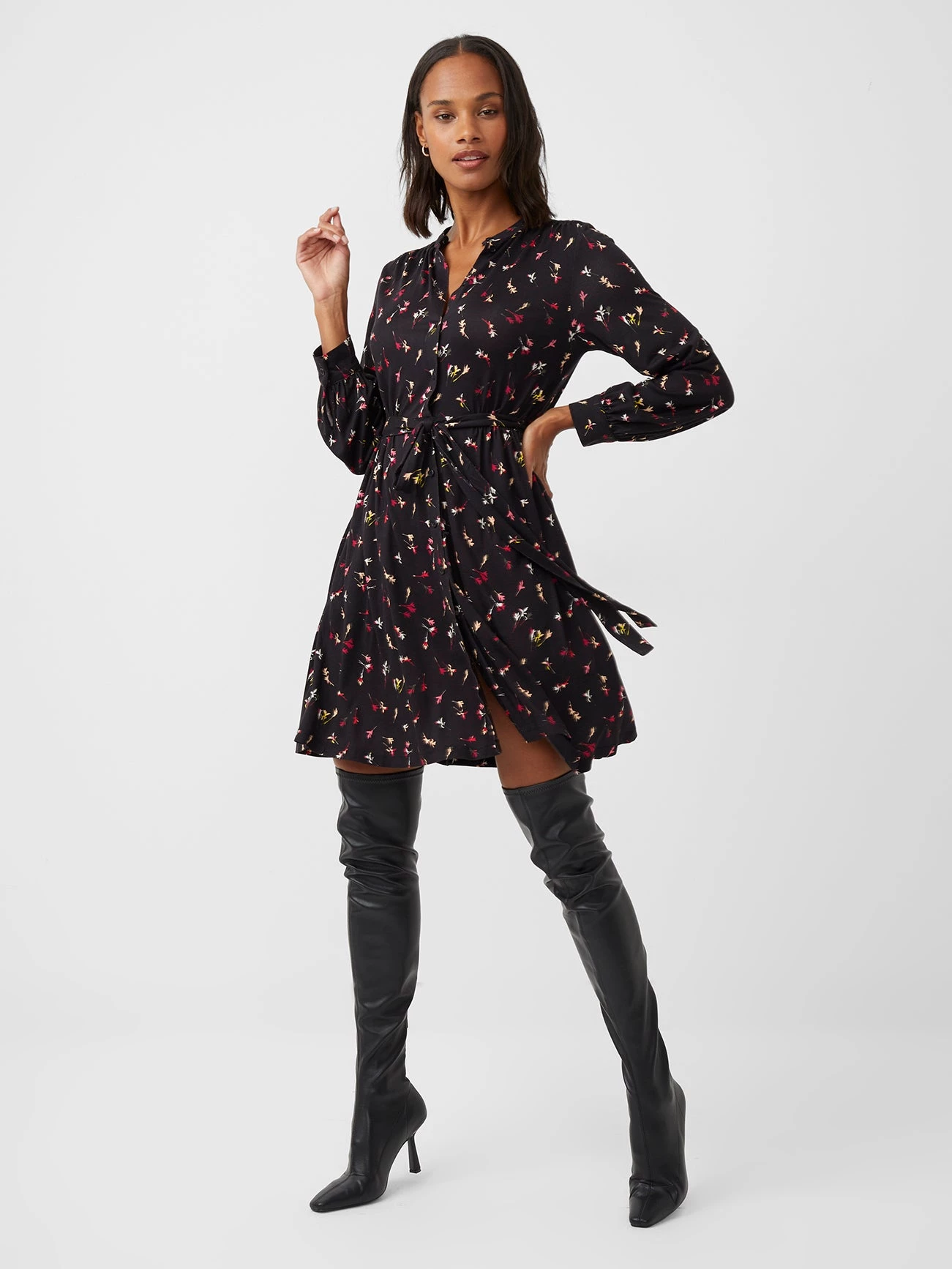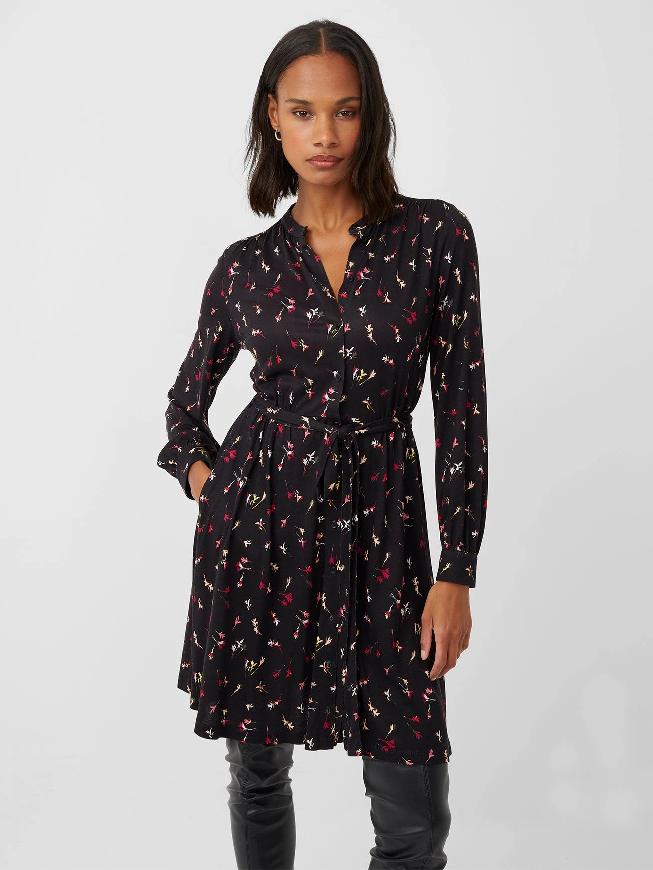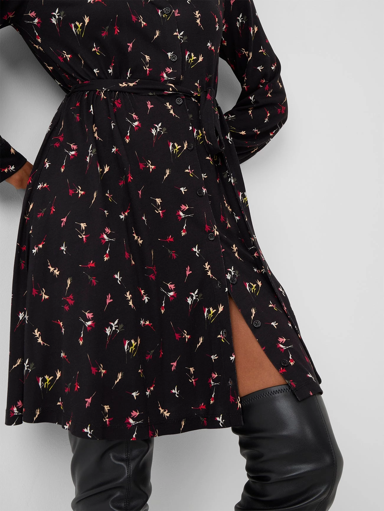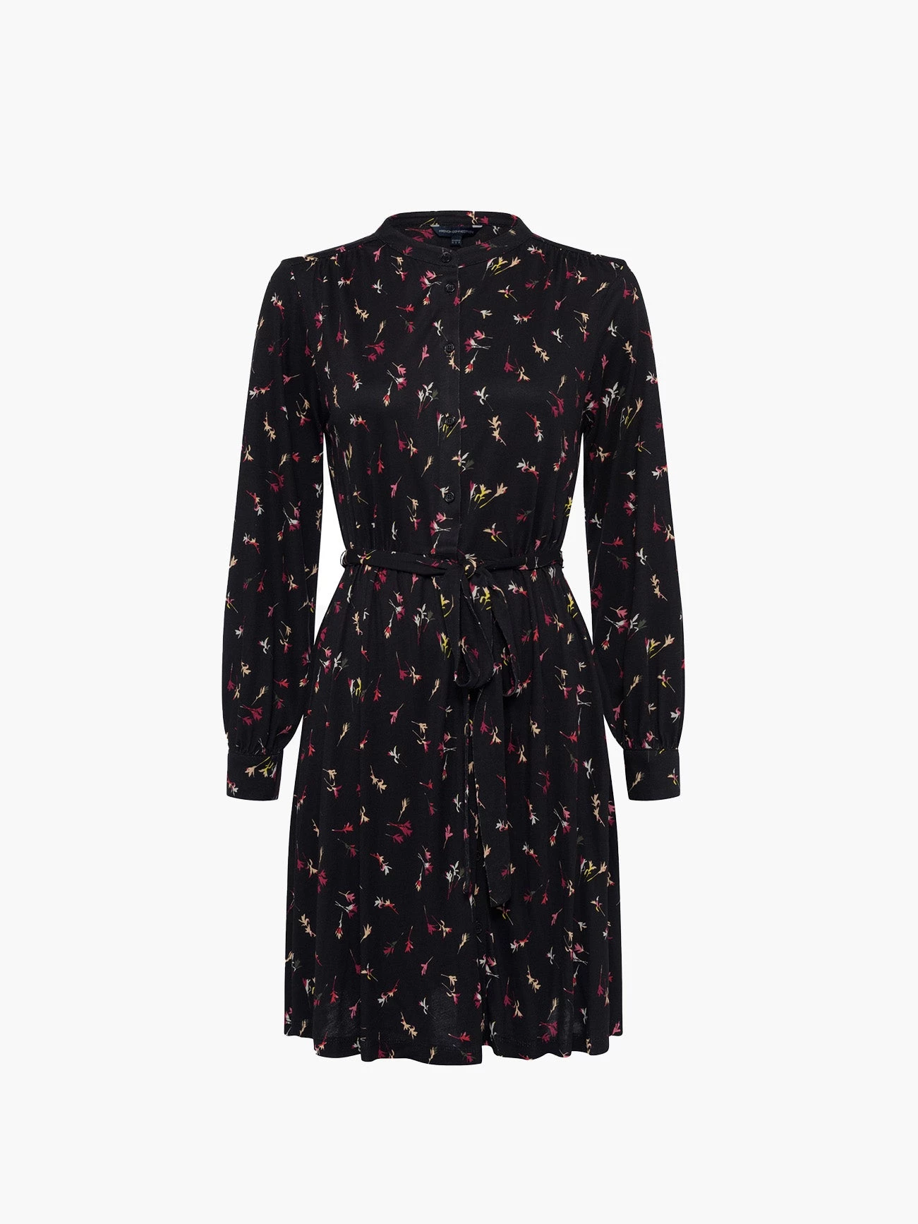 Striking the perfect balance of style and elegance, the Chiara Meadow Jersey Belted Dress has a mini silhouette, floral print and button-down front.