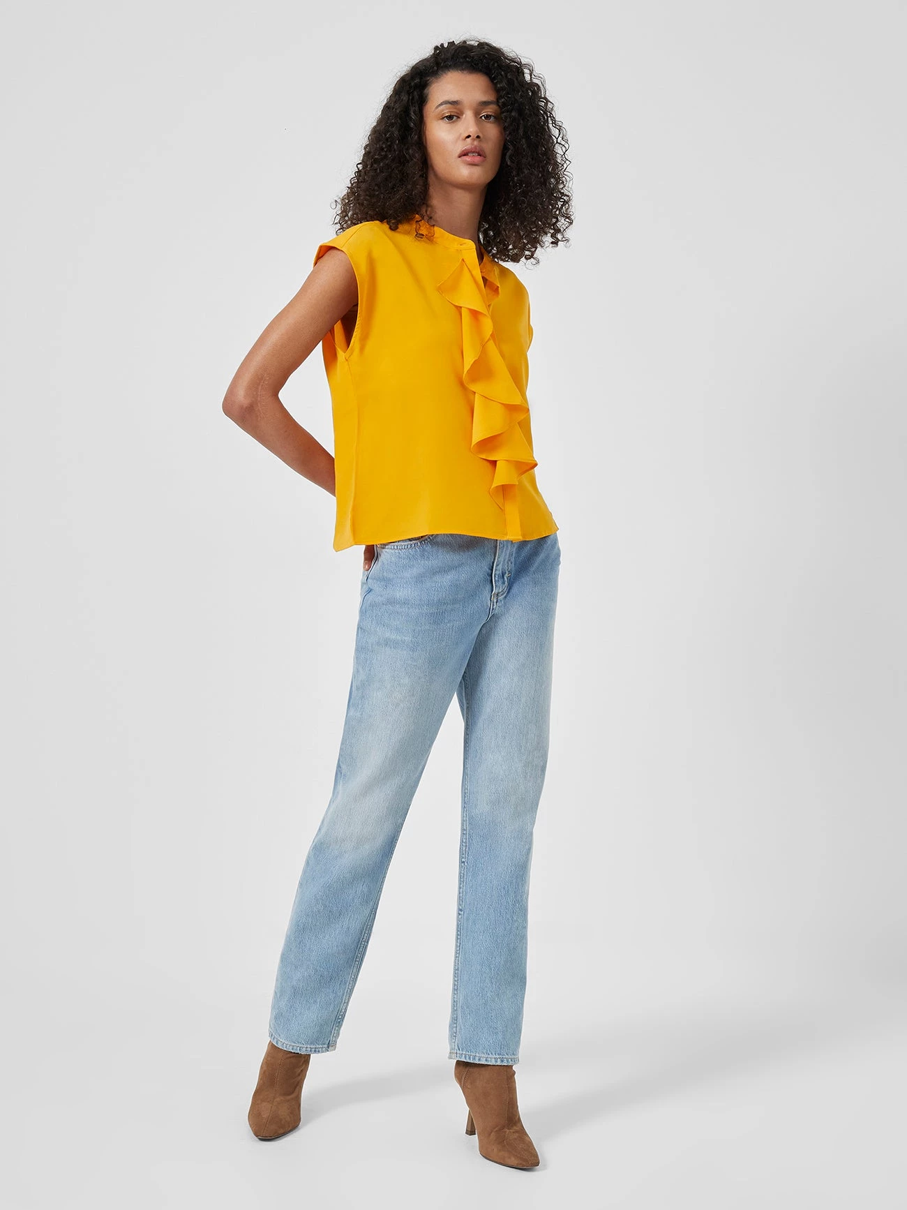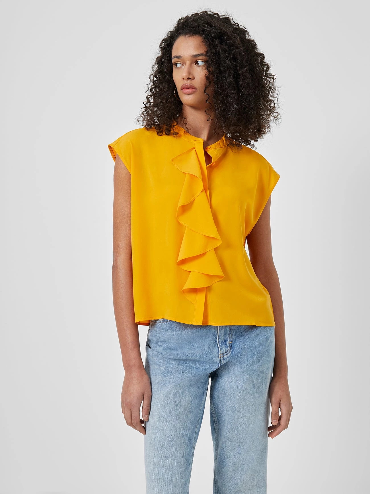 Be bold and beautiful this season with the Crepe Light Cropped Ruffle Blouse. A lightweight must-have with cropped sleeves and playful ruffles – the front-button may be optional, but being on-trend with this blouse is a given.