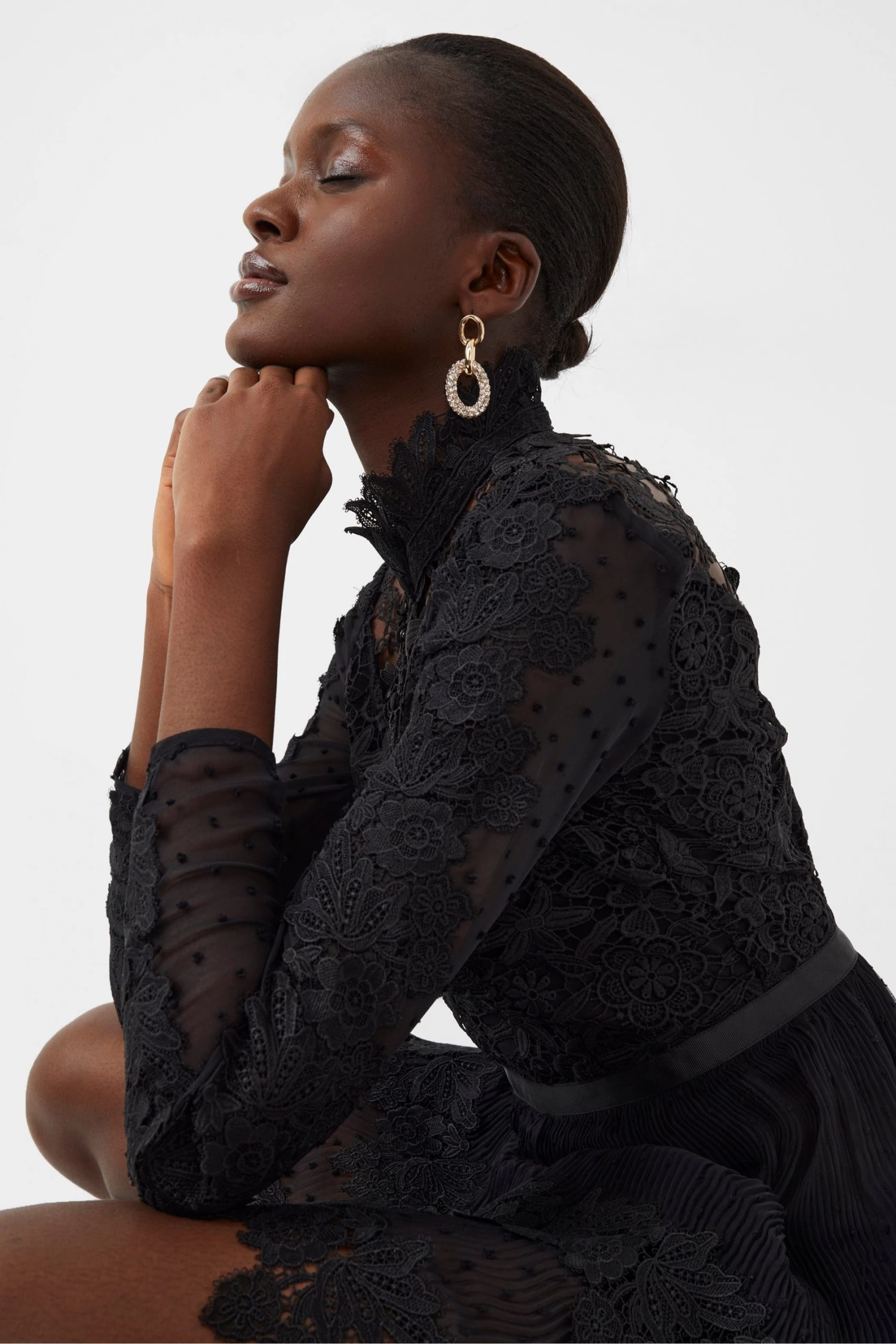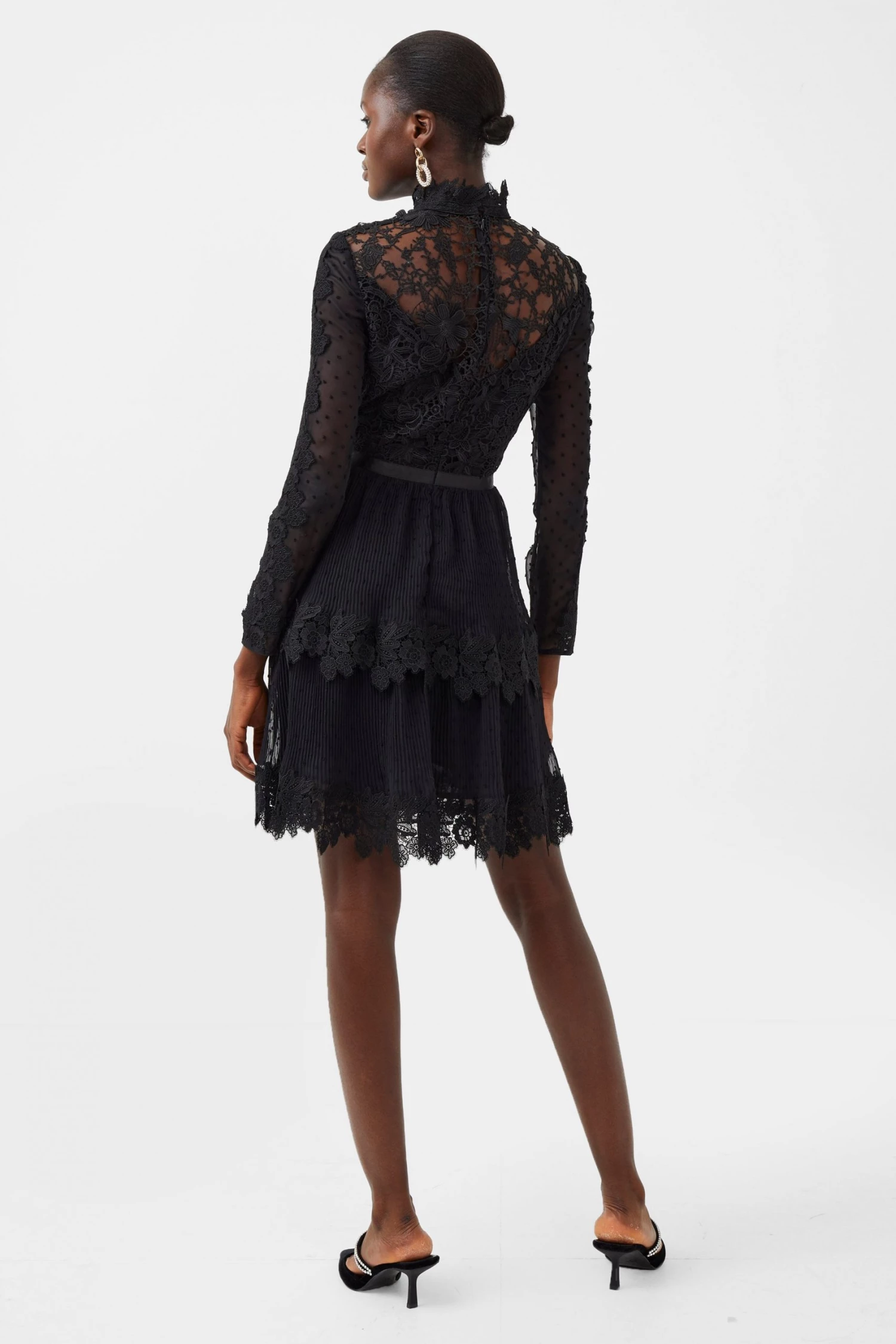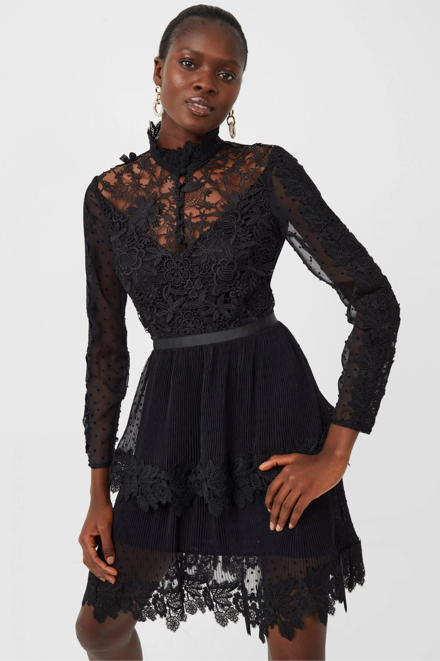 Steal the spotlight everywhere you go in the Gariana Lace Mini Dress. Constructed from embroidered lace panels, it has a dramatic high neckline.