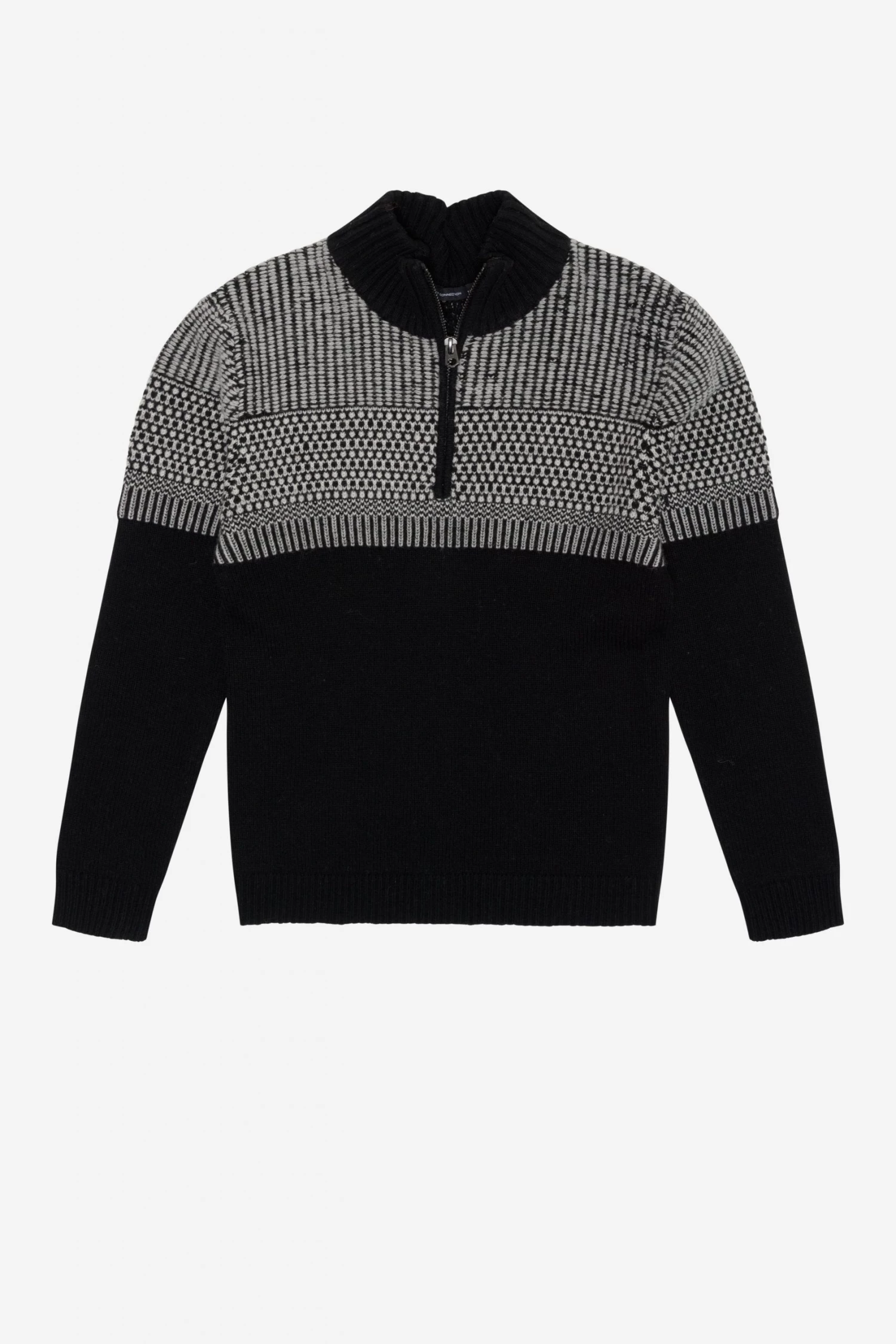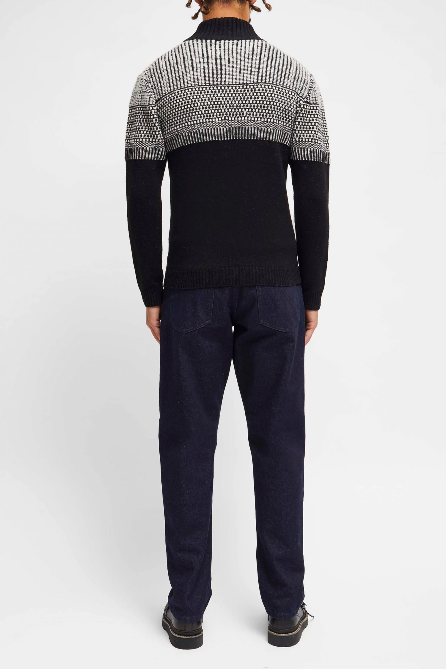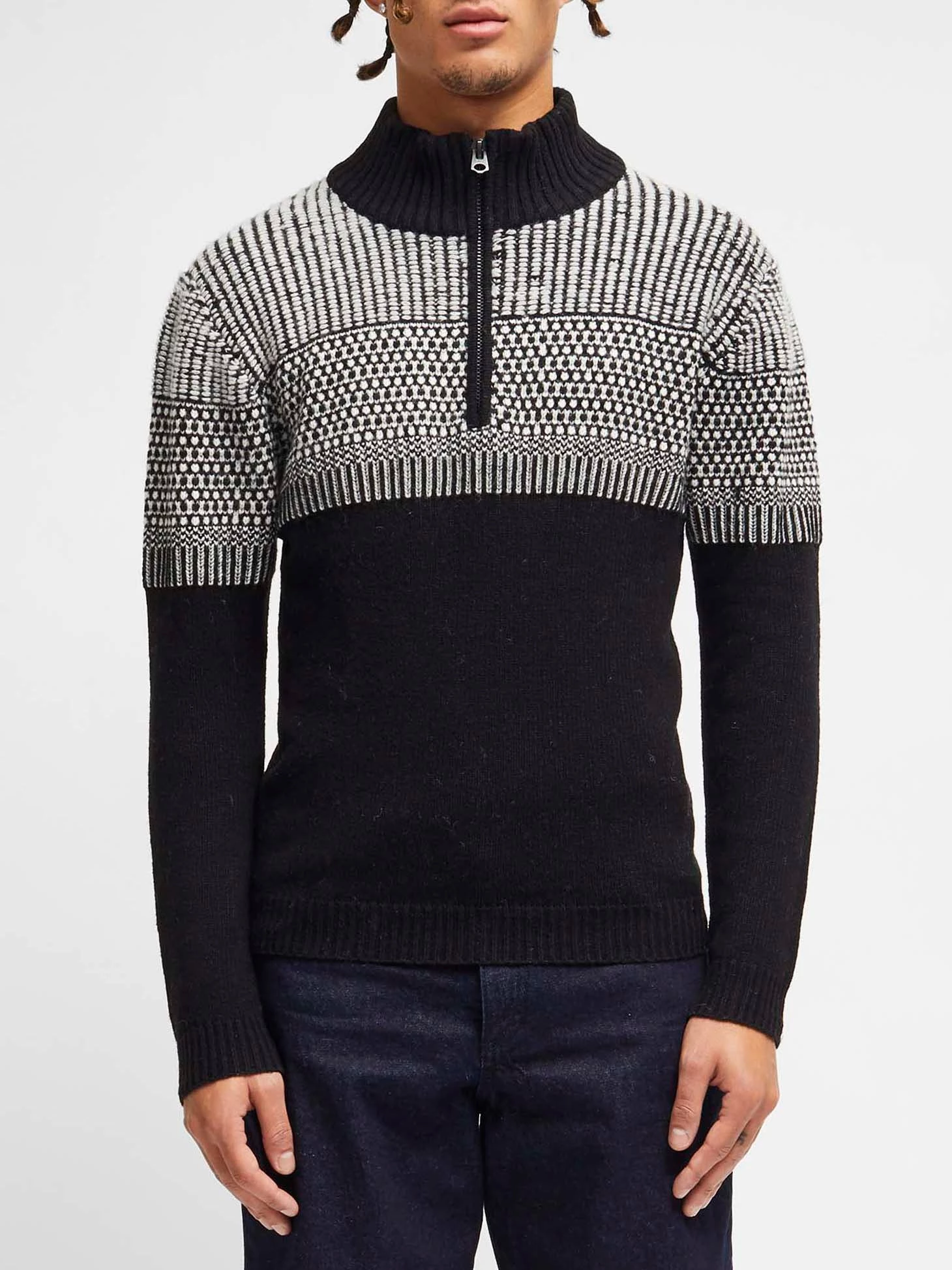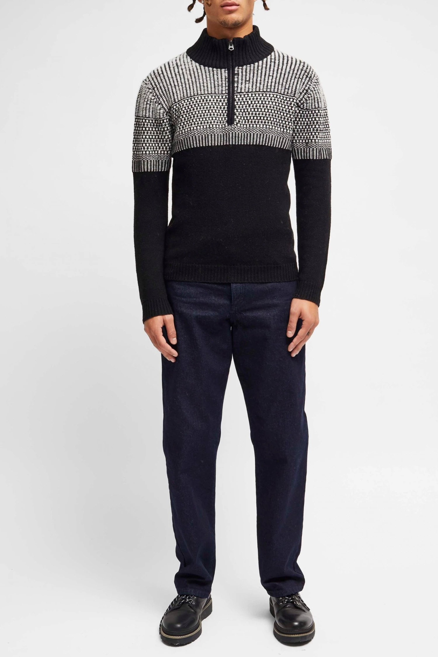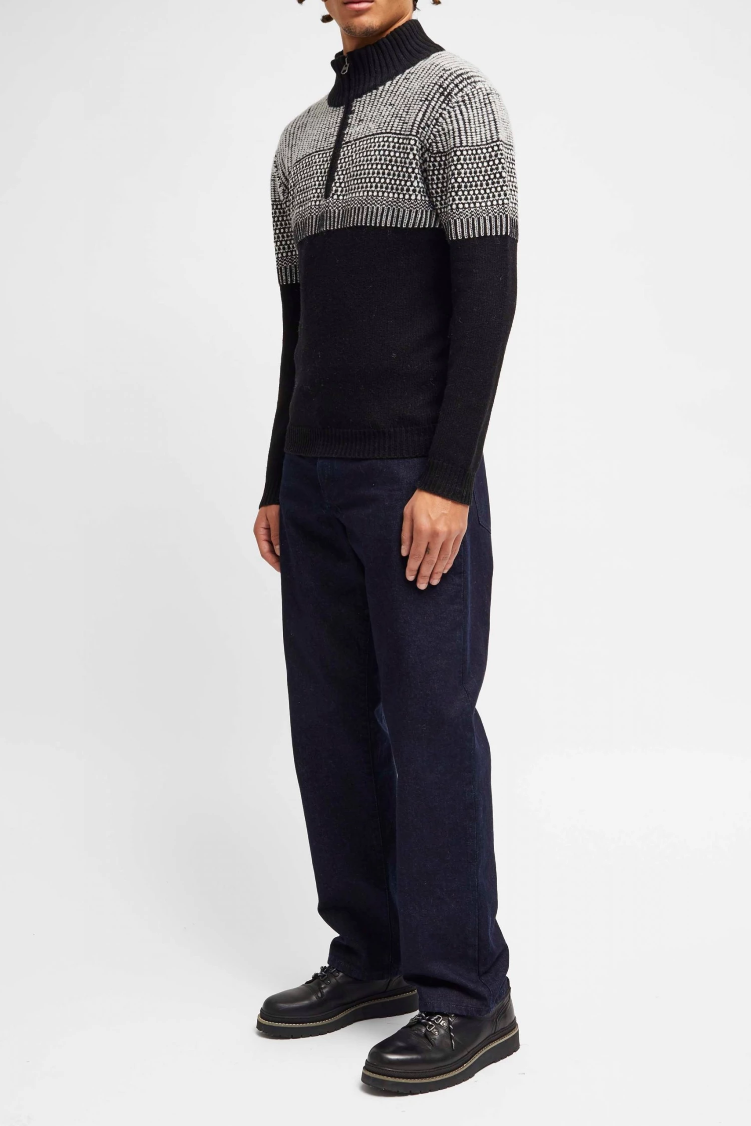 No need for knitting needles. The Graphic Jacquard Half-Zip Jumper has a warm construction, jacquard design and half-zip fastening at the comfortable funnel neckline.