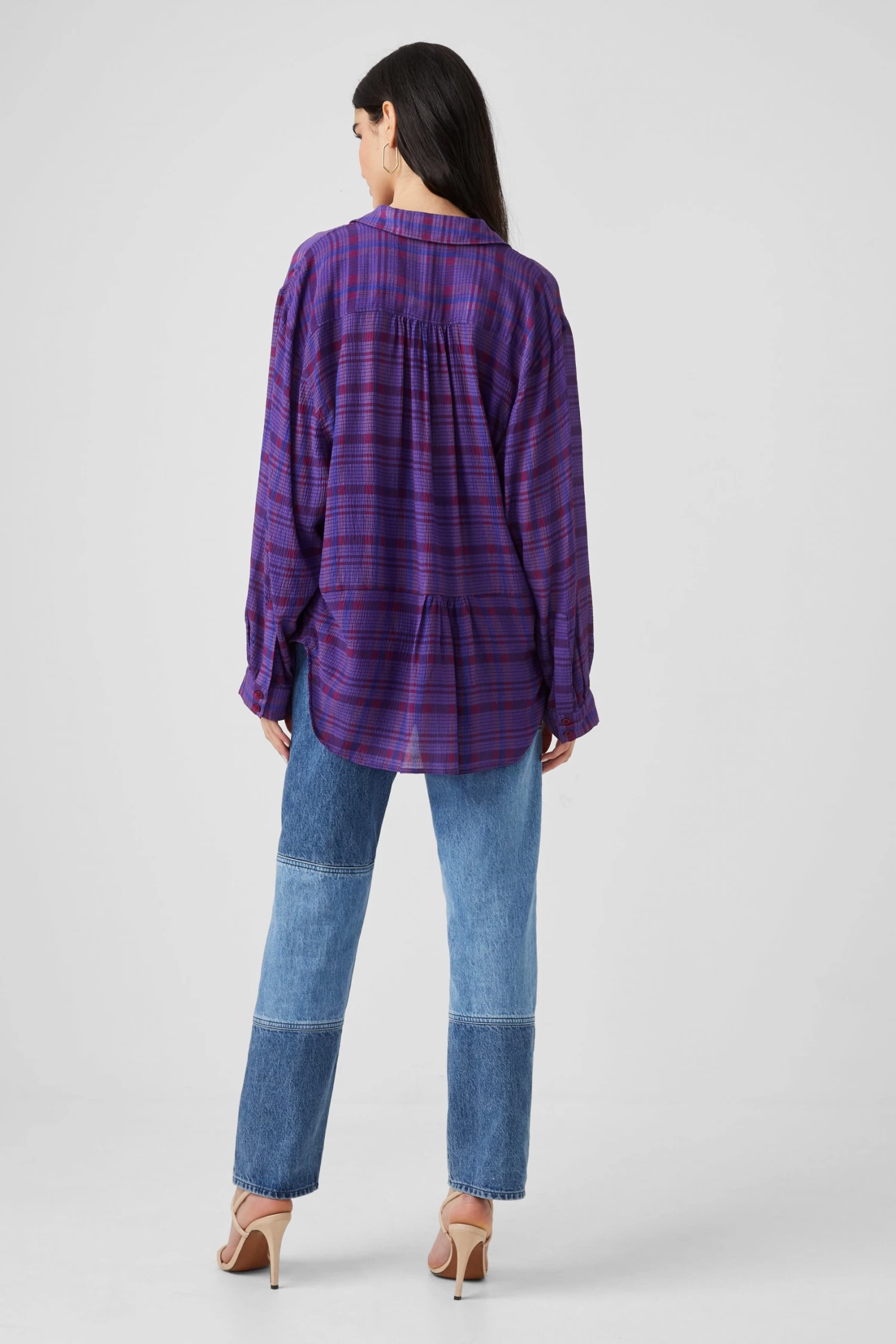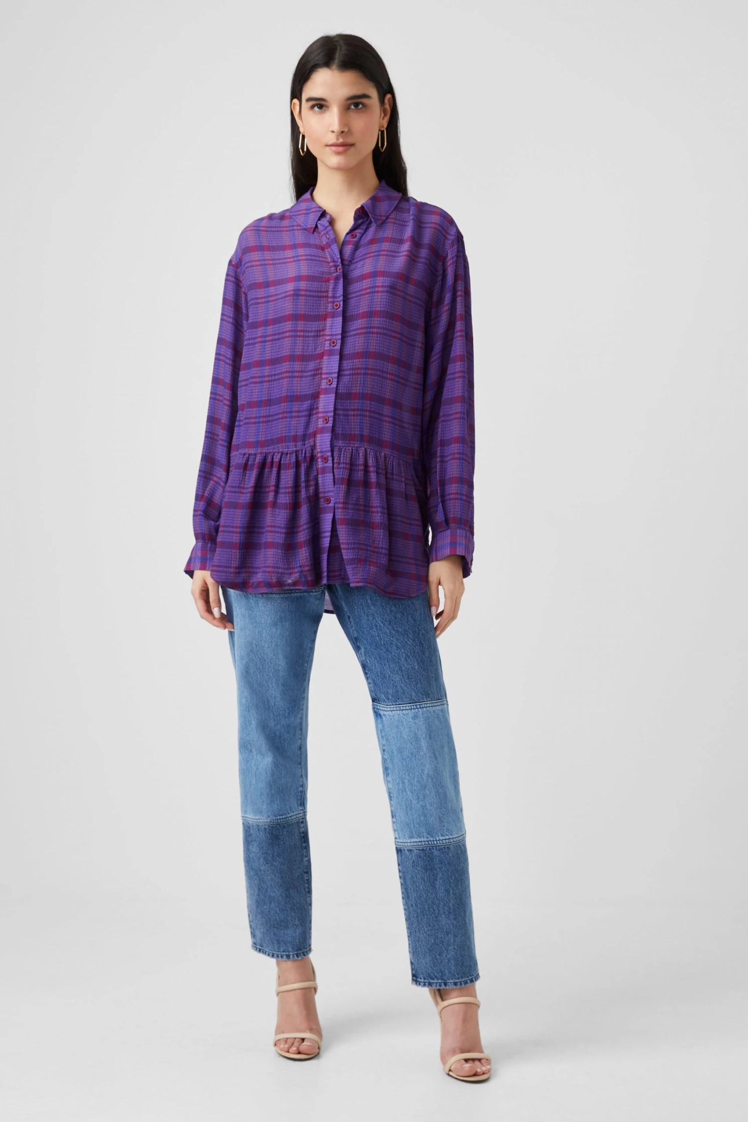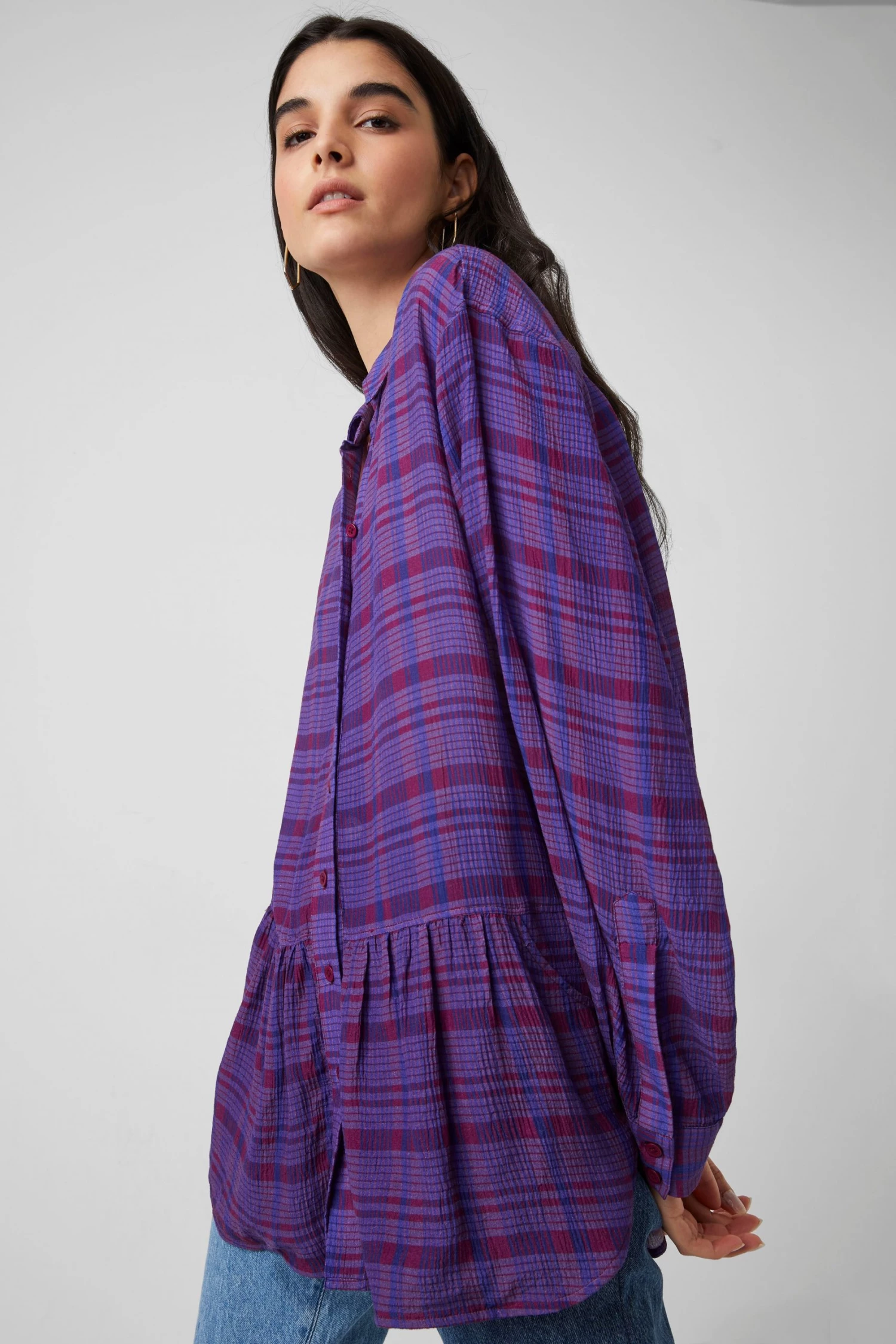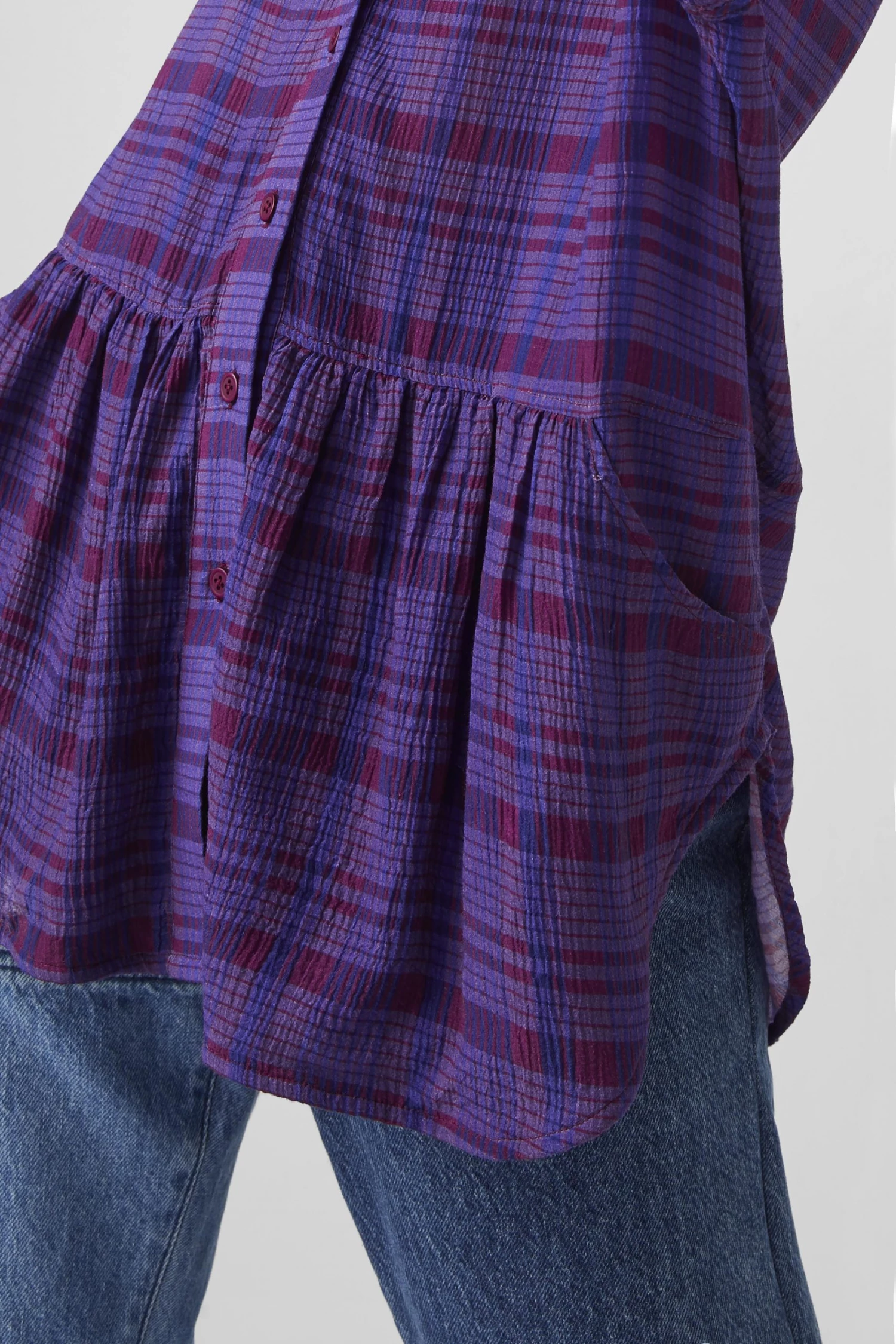 The Gwen Fine Crinkle Rayon Shirt is a wardrobe hero for weekdays and beyond. In a crinkle-effect fabric, it’s awash with a check print.