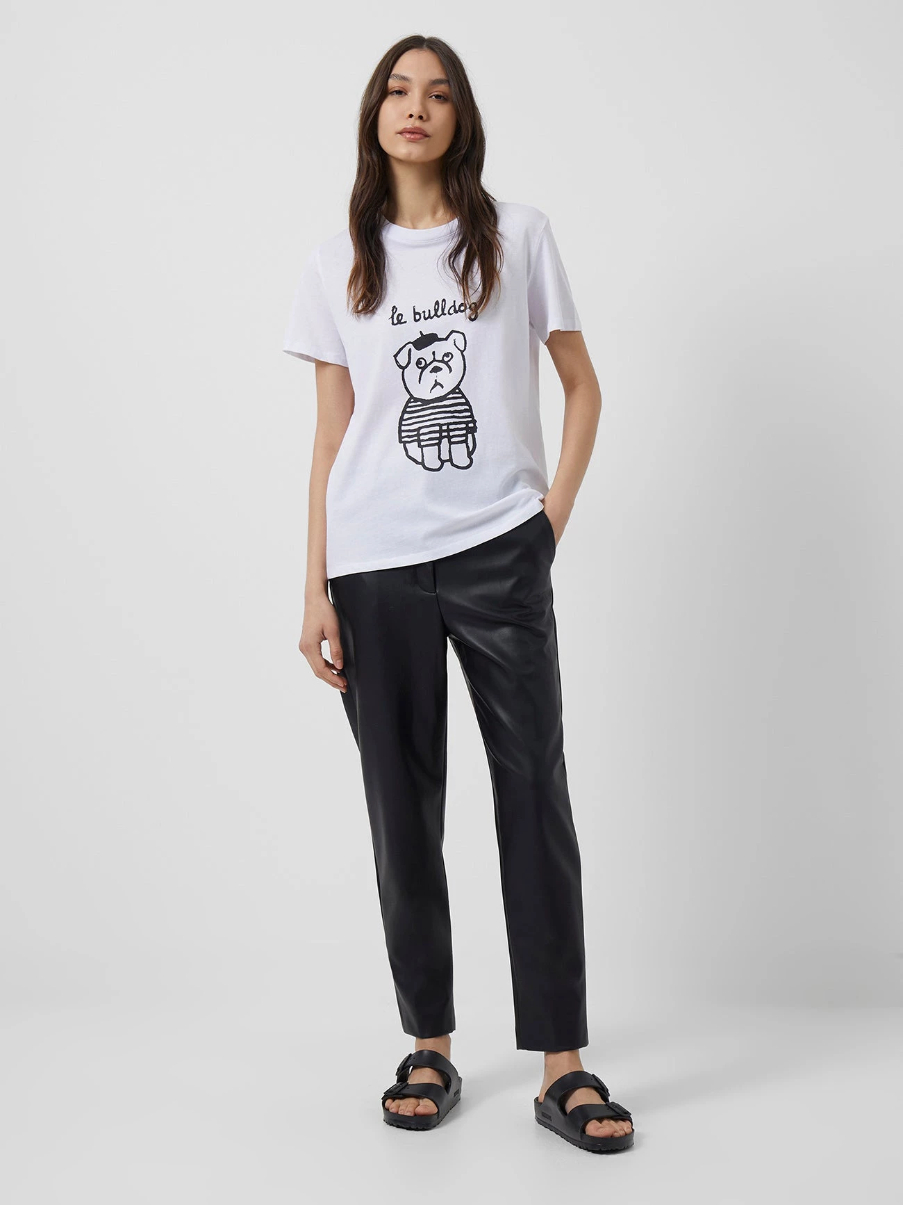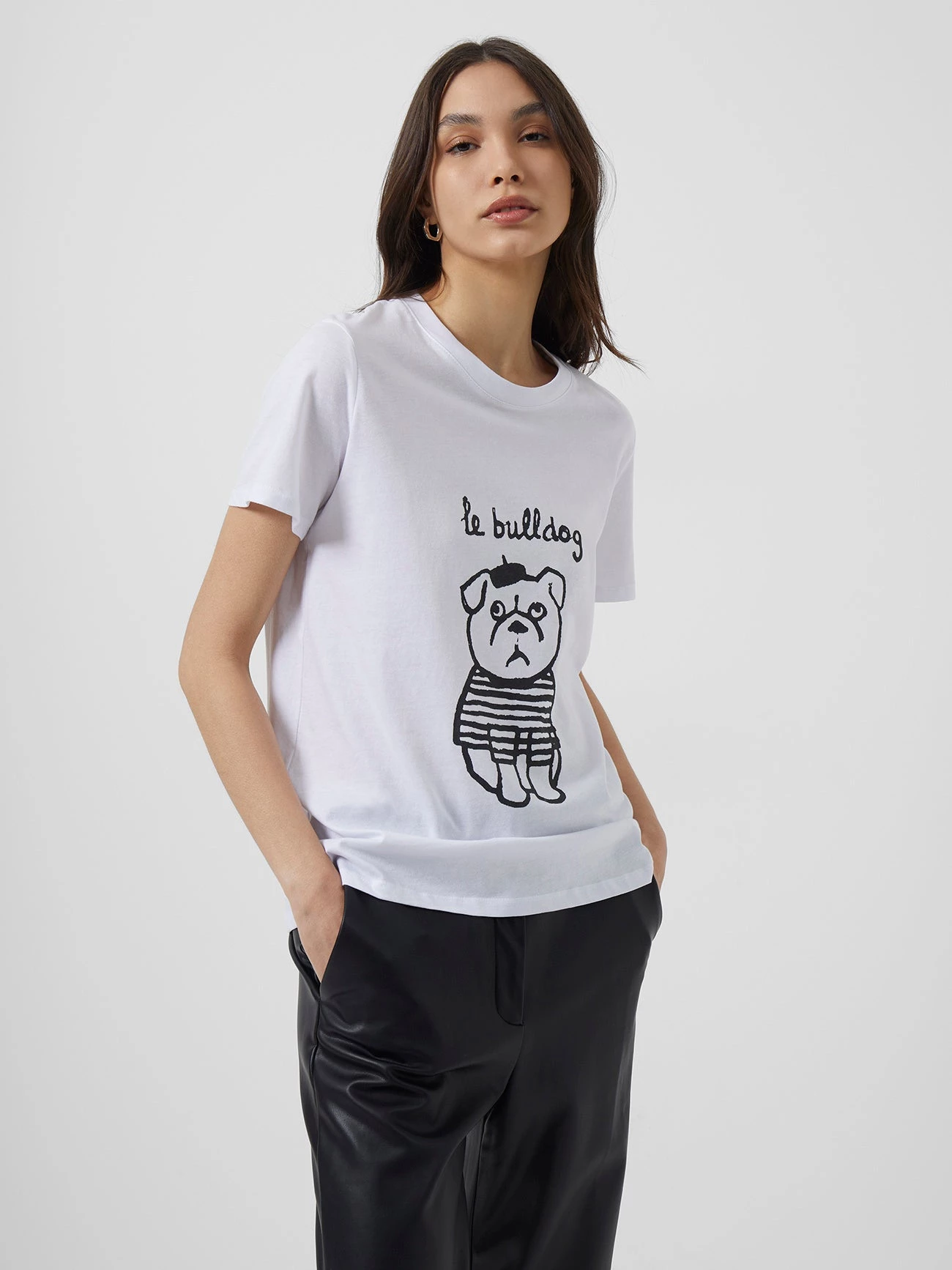 Add some French flair to your wardrobe with this Parisian pooch. With a crew neckline and short sleeves, the Le Bulldog Boyfit T-Shirt presents an adorable graphic print portraying a bulldog in stripes and a beret, magnifiquè.