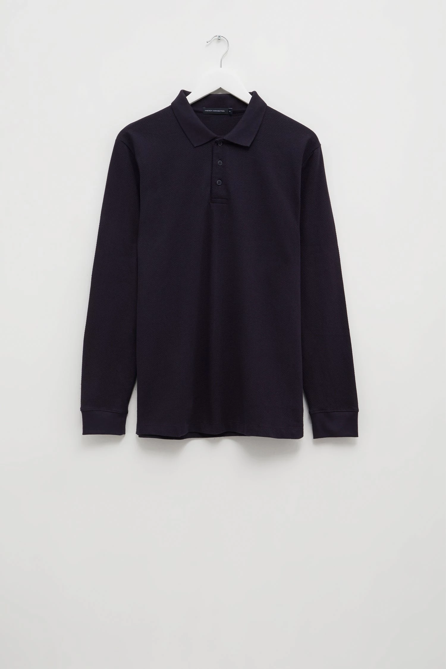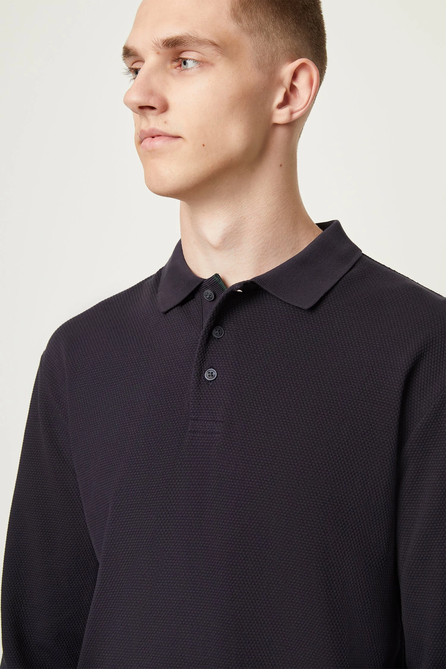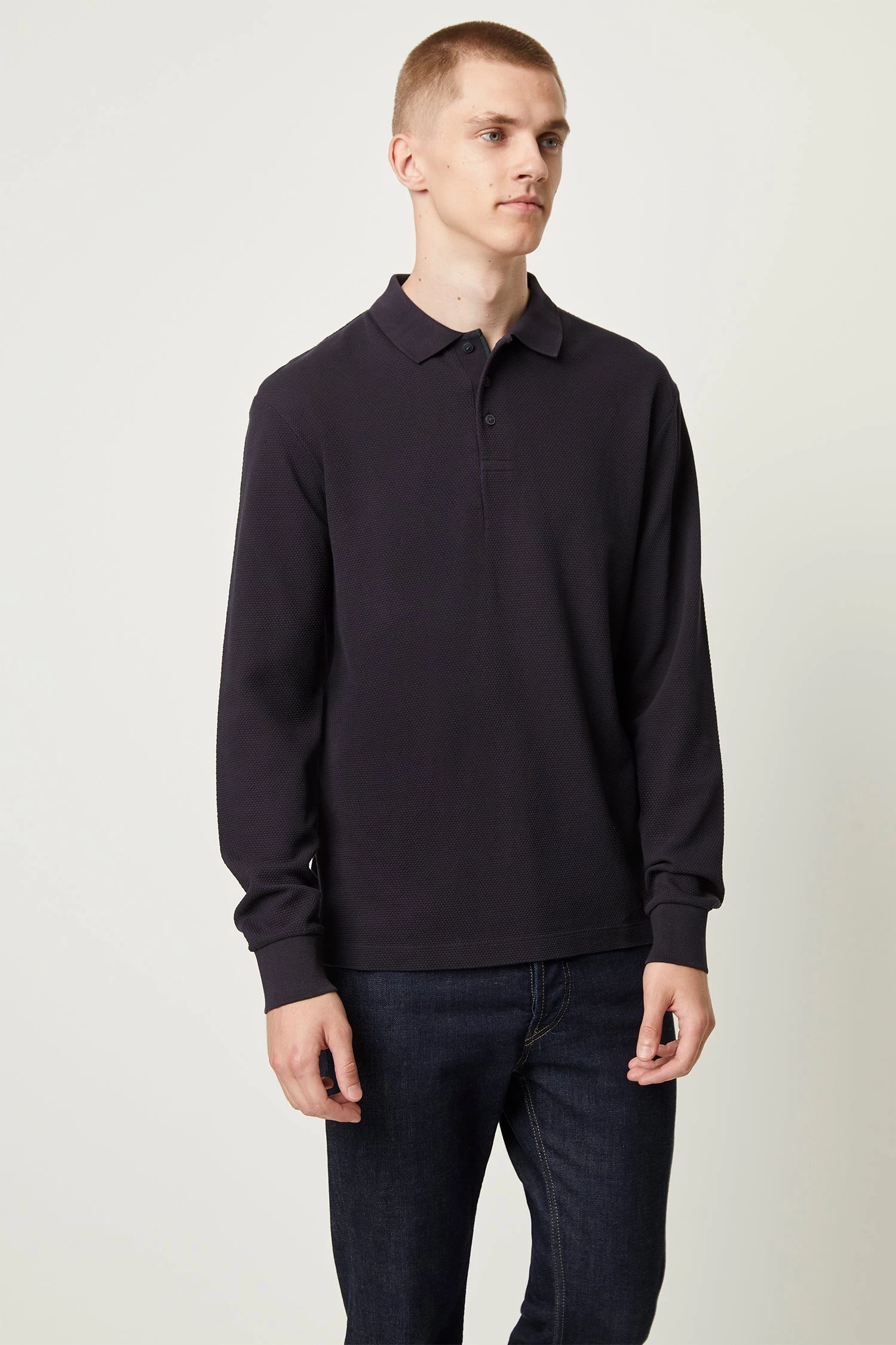 Essential to every man’s wardrobe, the long sleeve polo top is a comfortable classic. Featuring a simple three-button placket and point collar design, the top gains interest from its textured popcorn fabric. Pair yours with chinos or jeans for a look that combines comfort and style for your off-duty days.