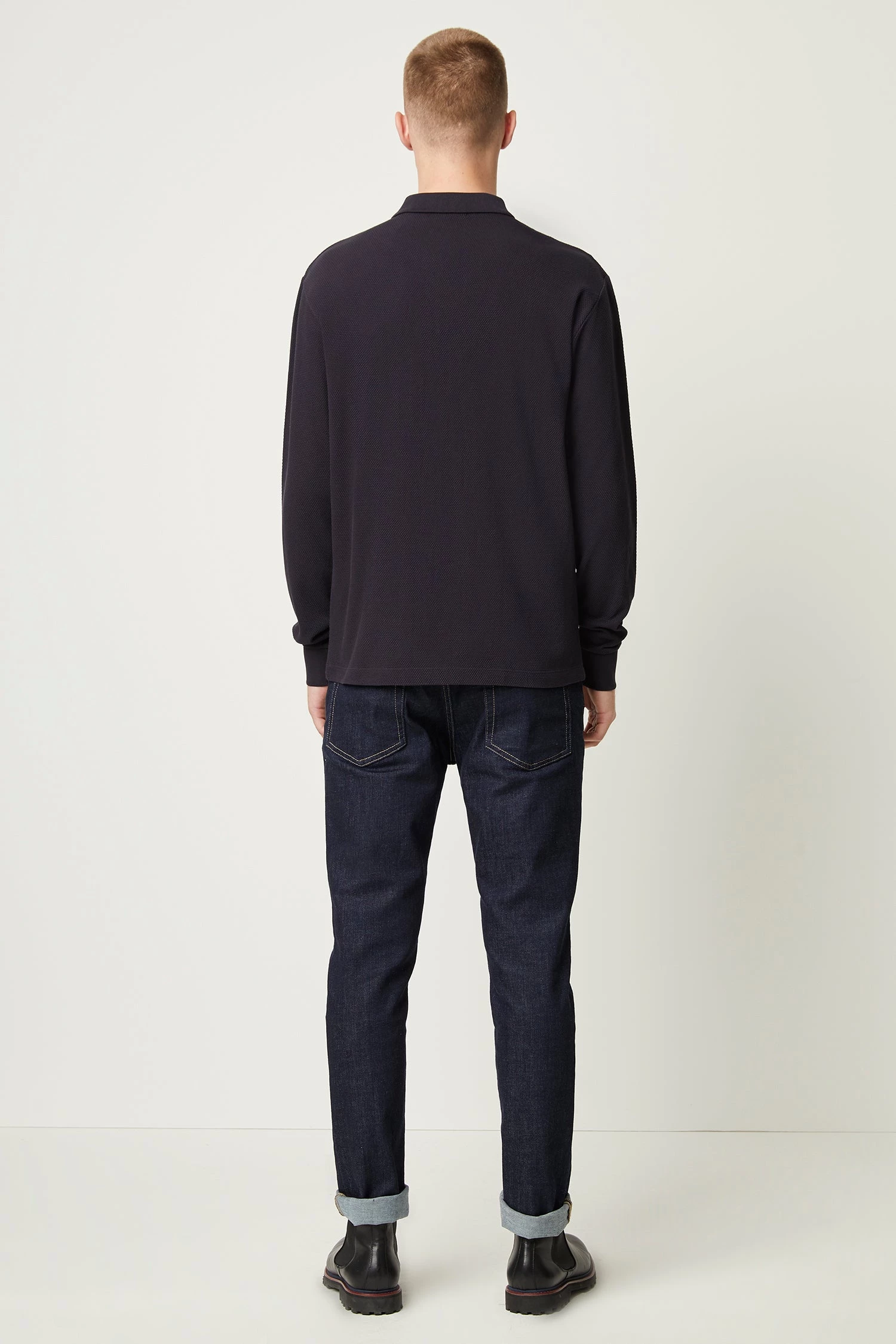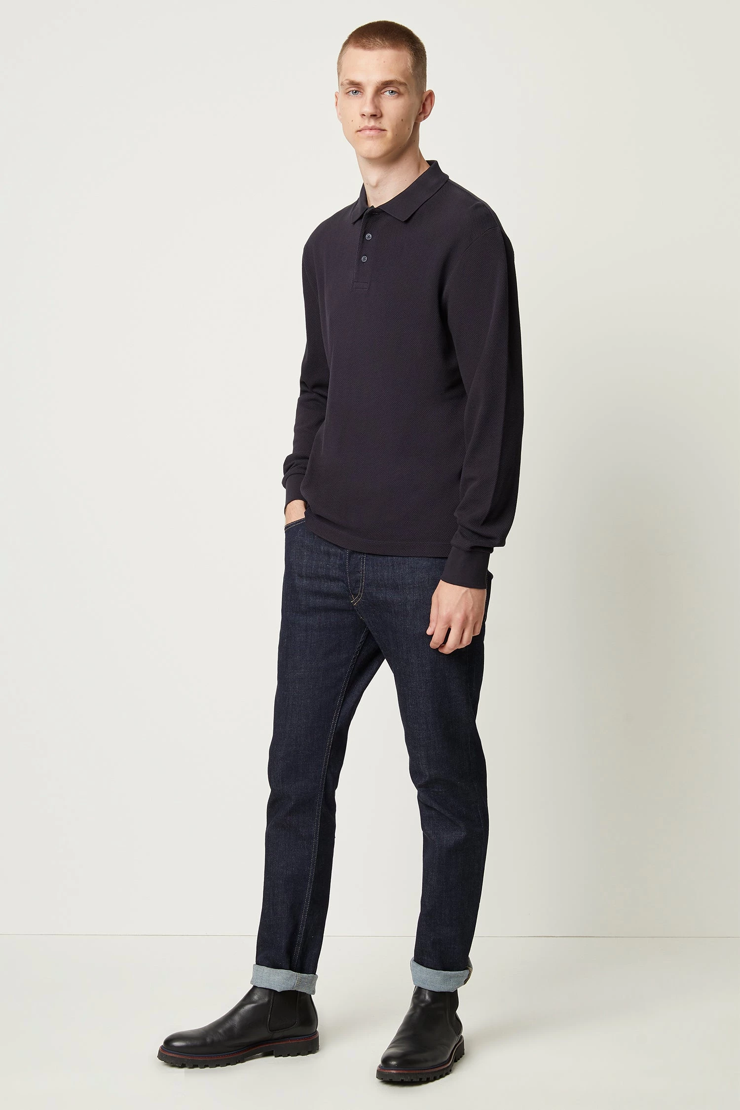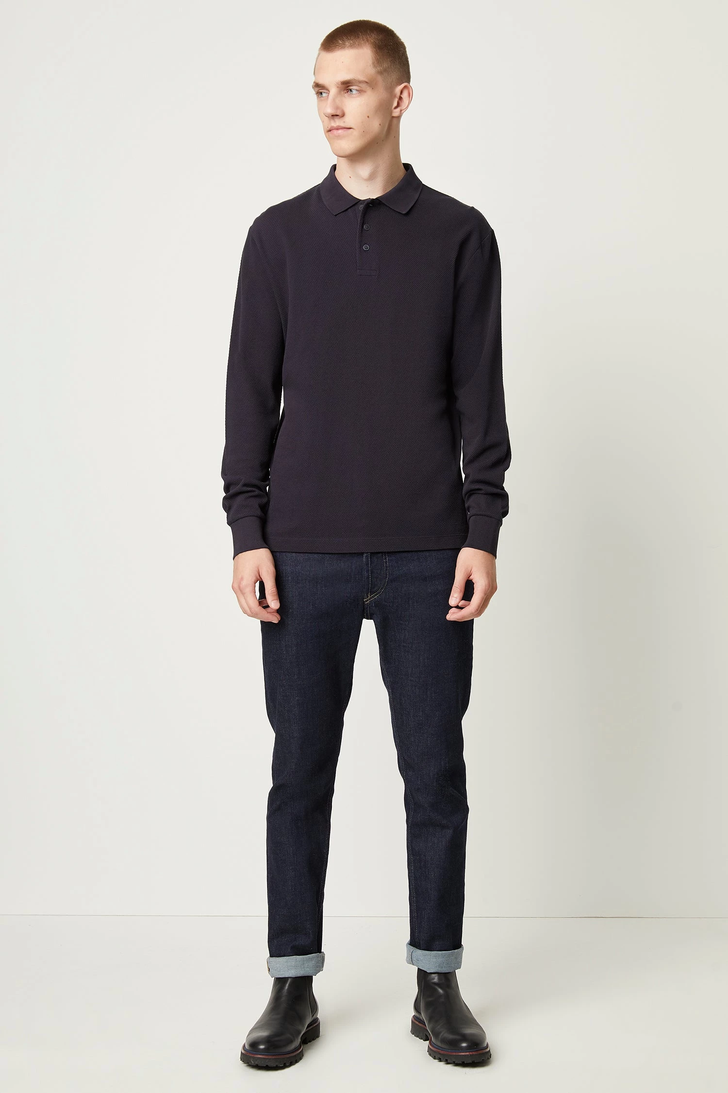 Essential to every man’s wardrobe, the long sleeve polo top is a comfortable classic. Featuring a simple three-button placket and point collar design, the top gains interest from its textured popcorn fabric. Pair yours with chinos or jeans for a look that combines comfort and style for your off-duty days.