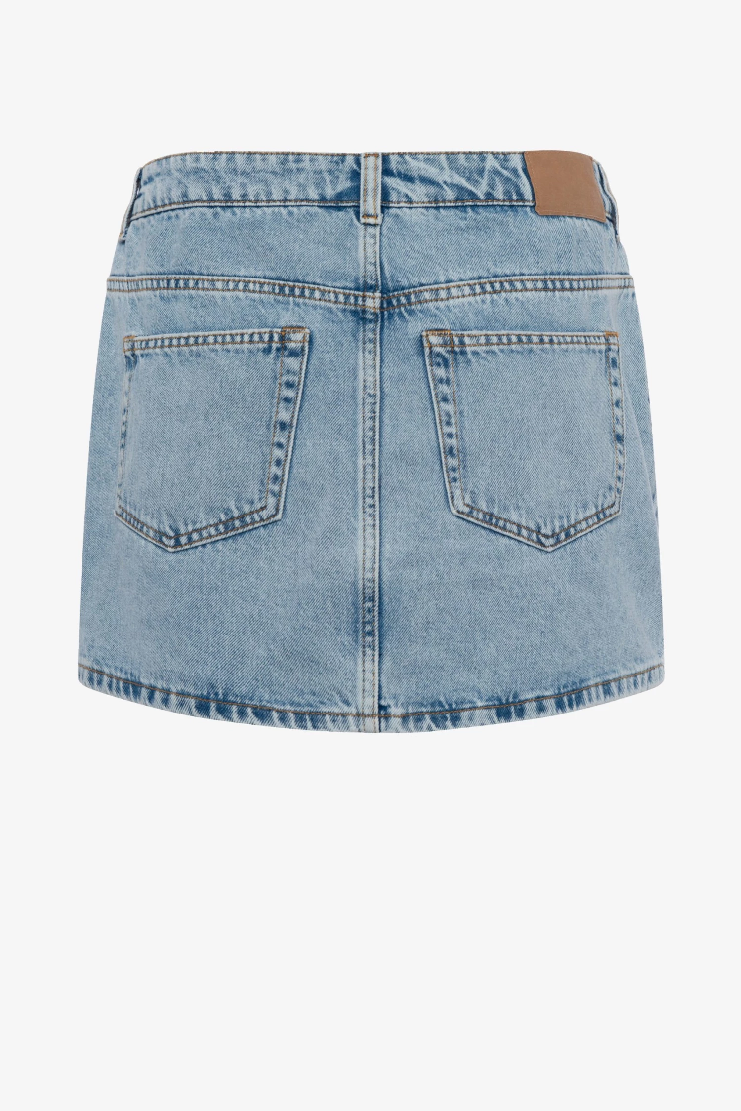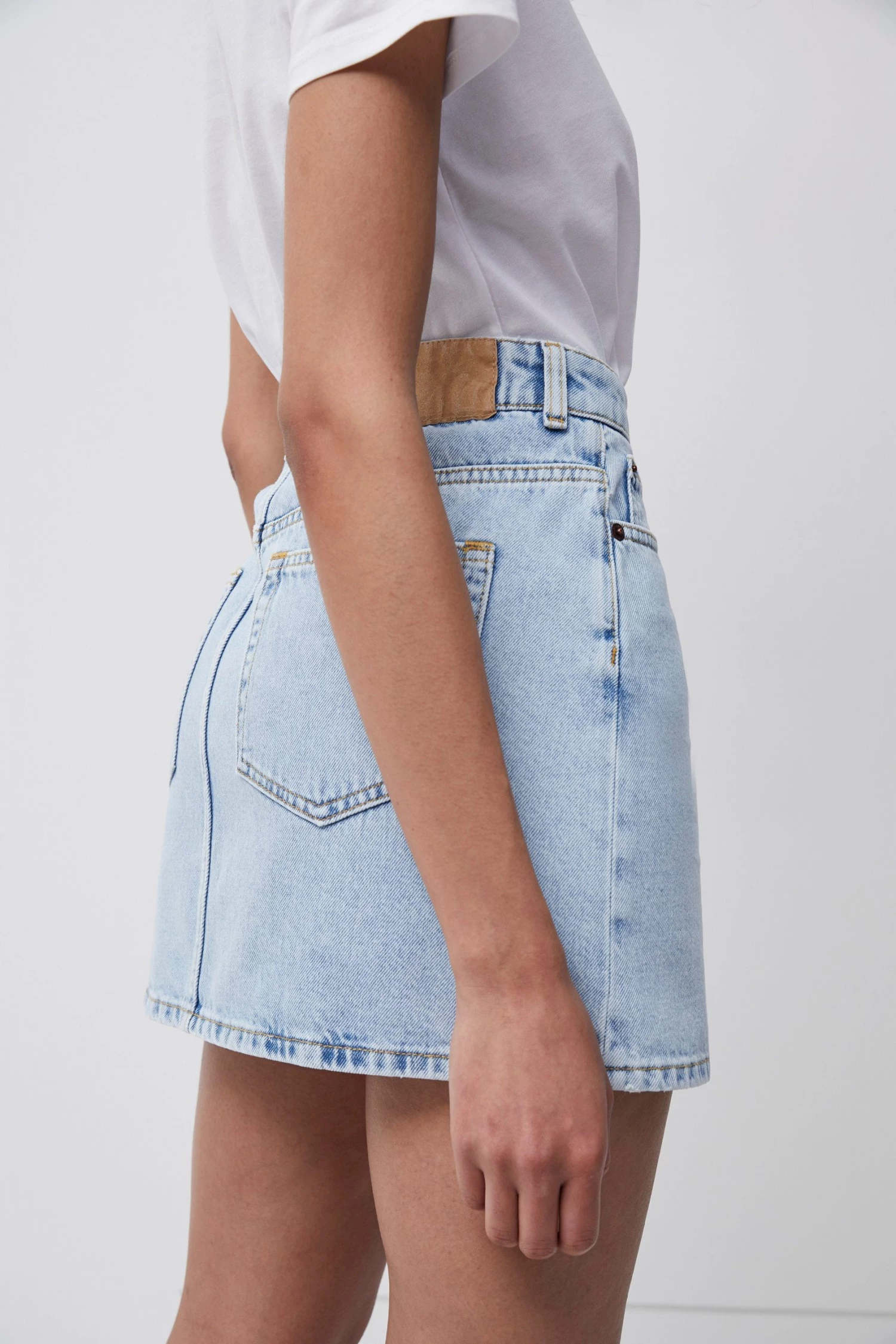 The Poppie Mini Skirt is a sleek style with refined sartorial status. It’s designed with a simple A-line silhouette and crafted from light-wash denim.