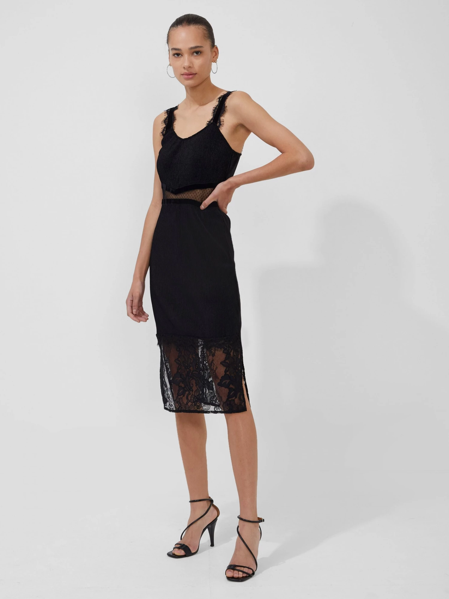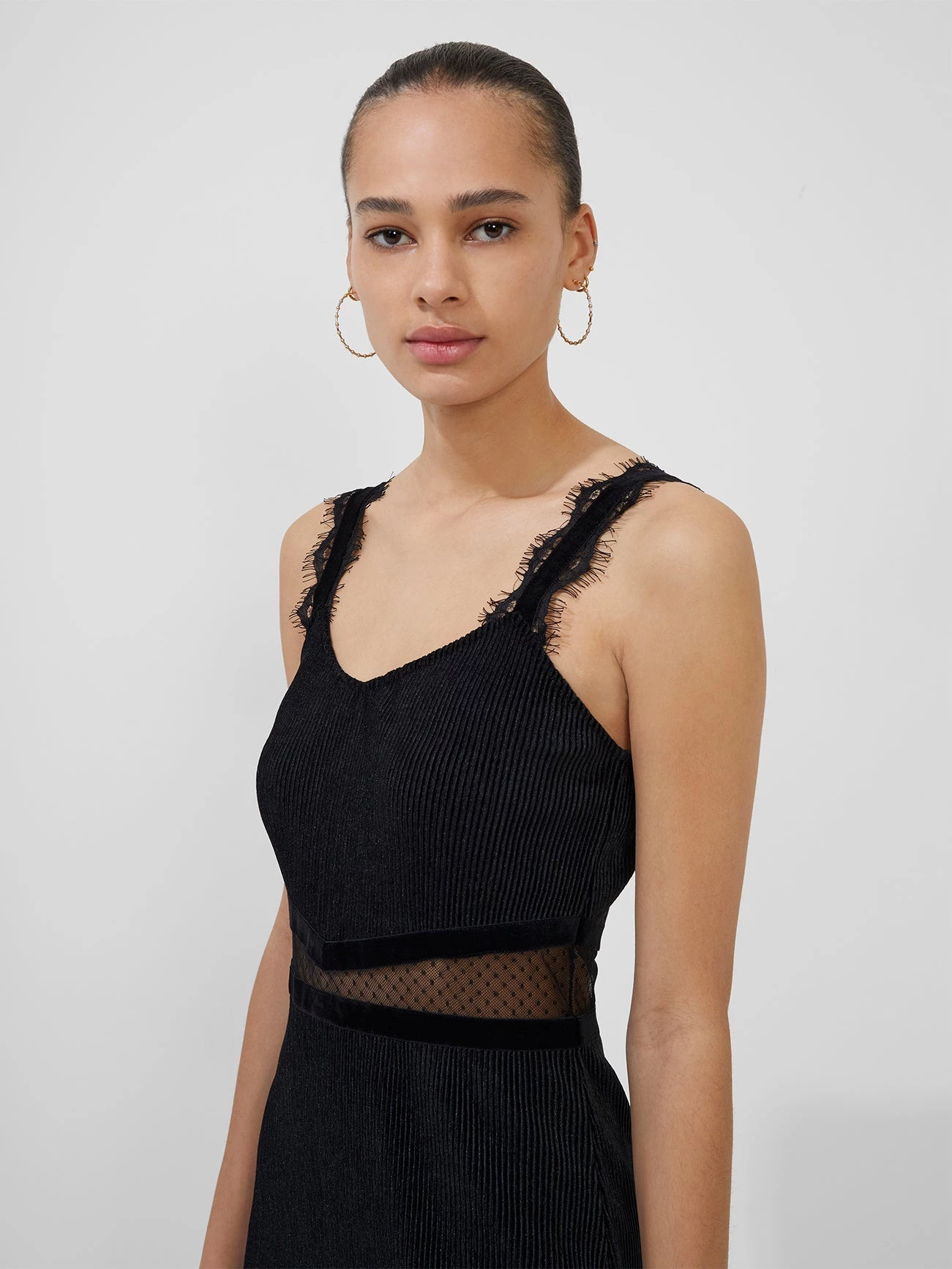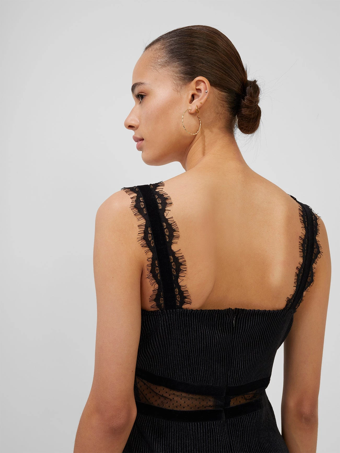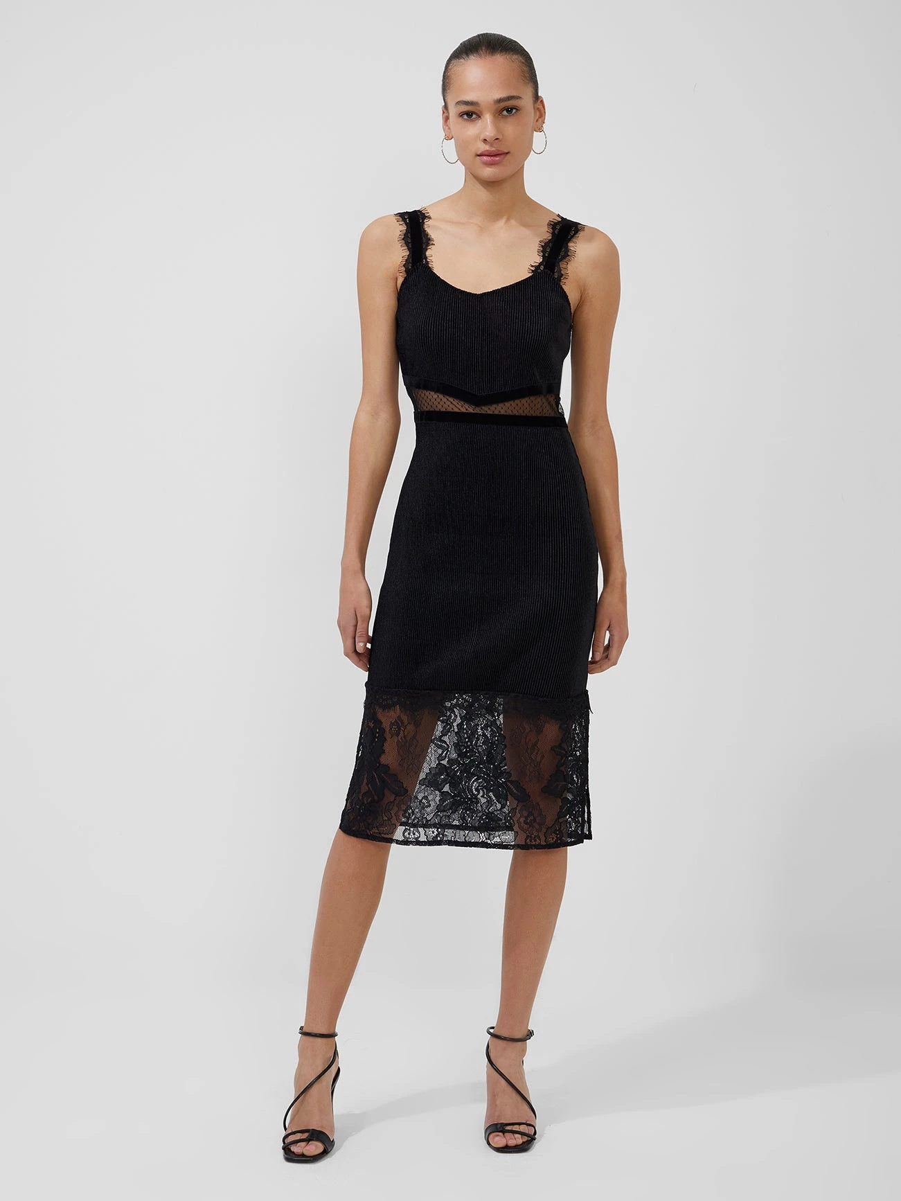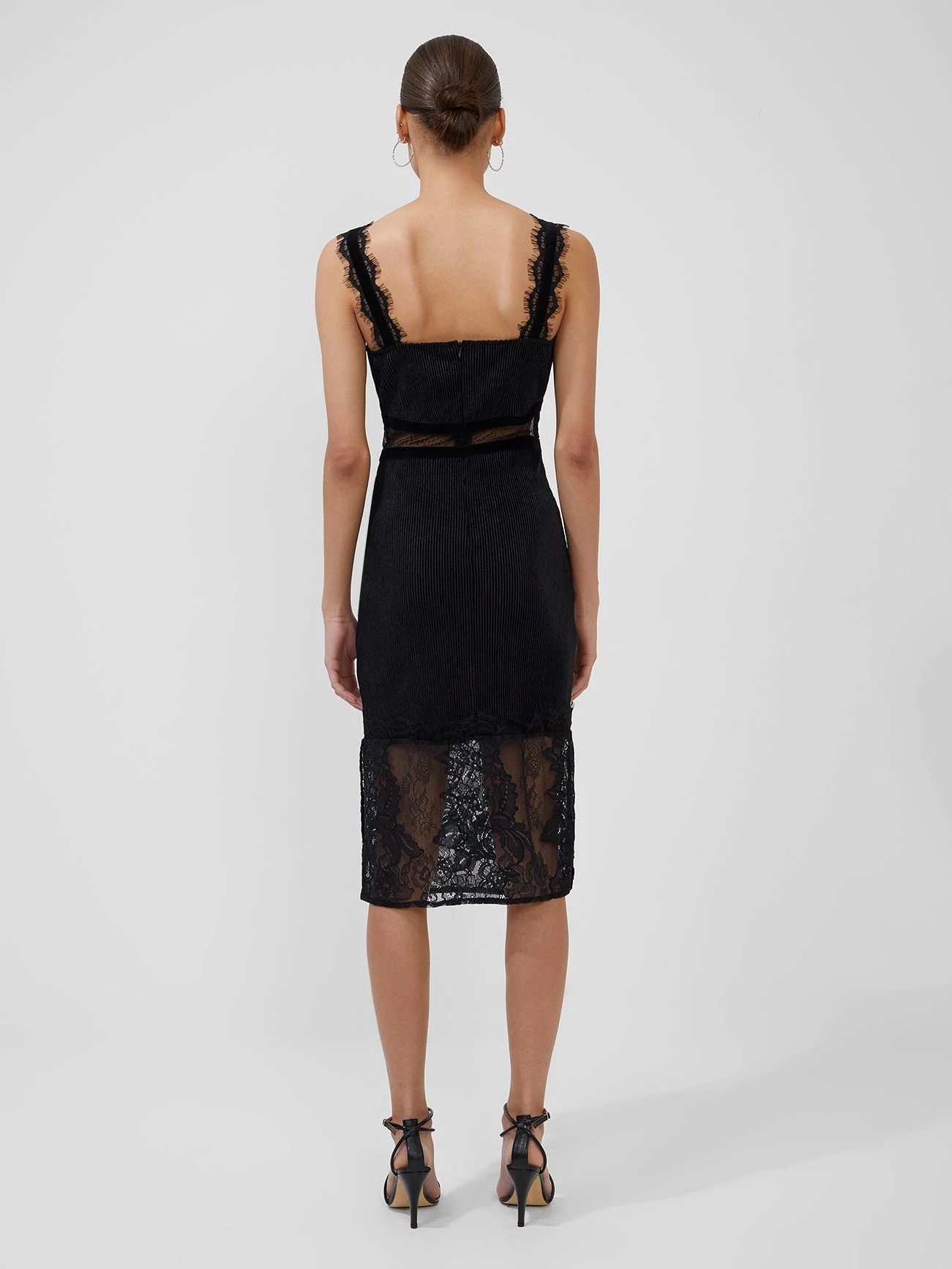 Go to the dark side with the Sarelle Ottoman Velvet Jersey Strappy Dress. It features a form-fitting silhouette, lace straps, lace hem, mesh inserts at the waist and midi length.