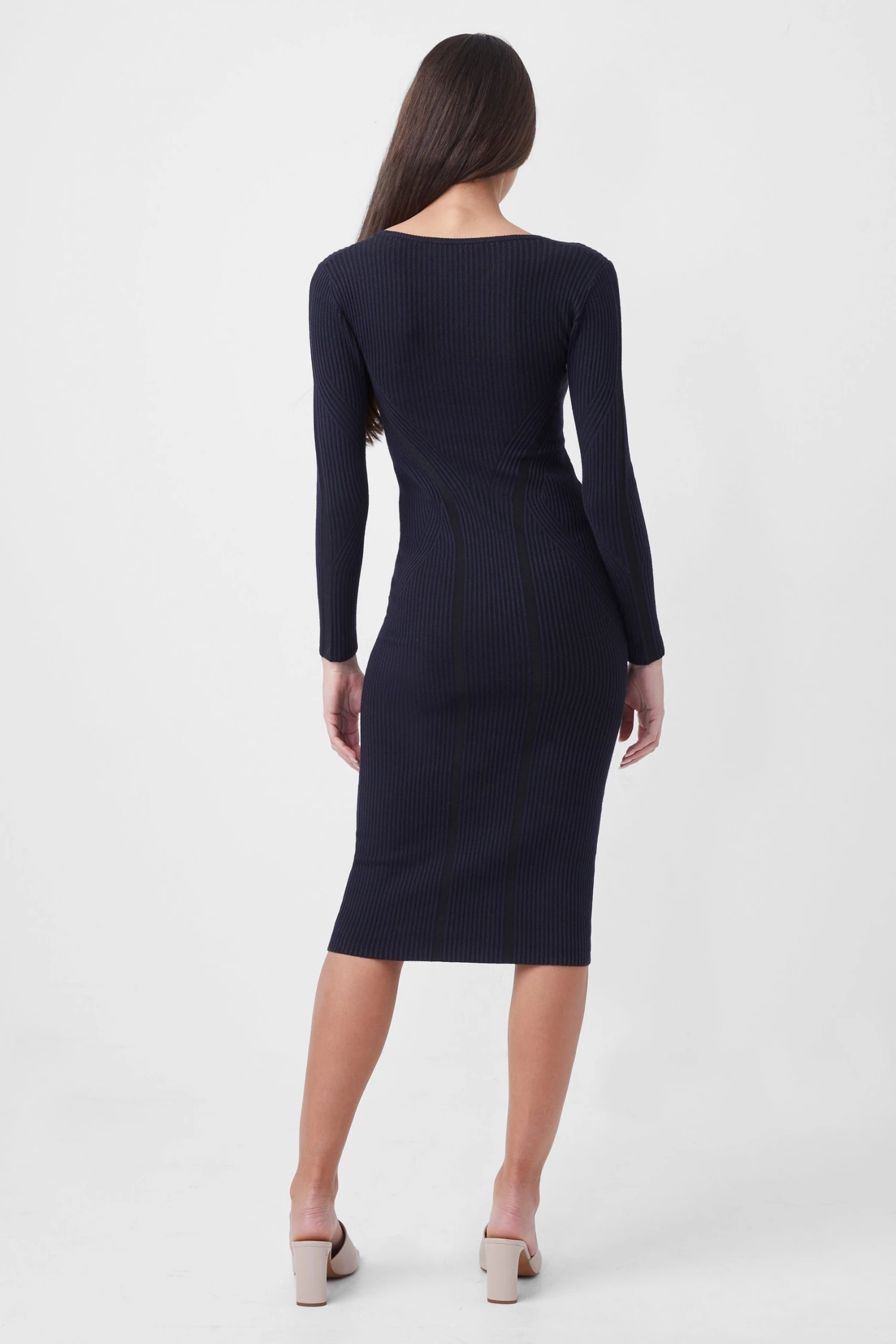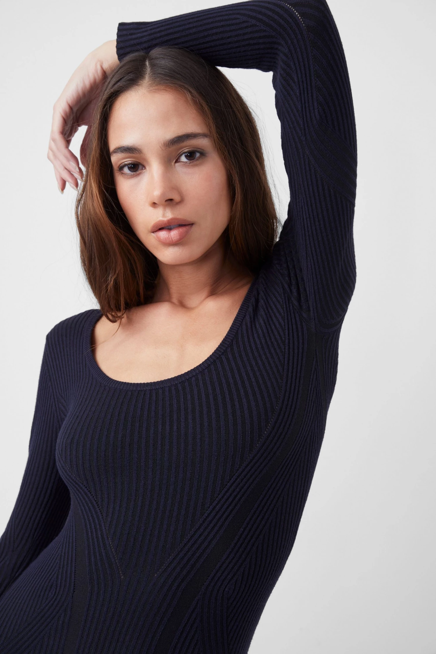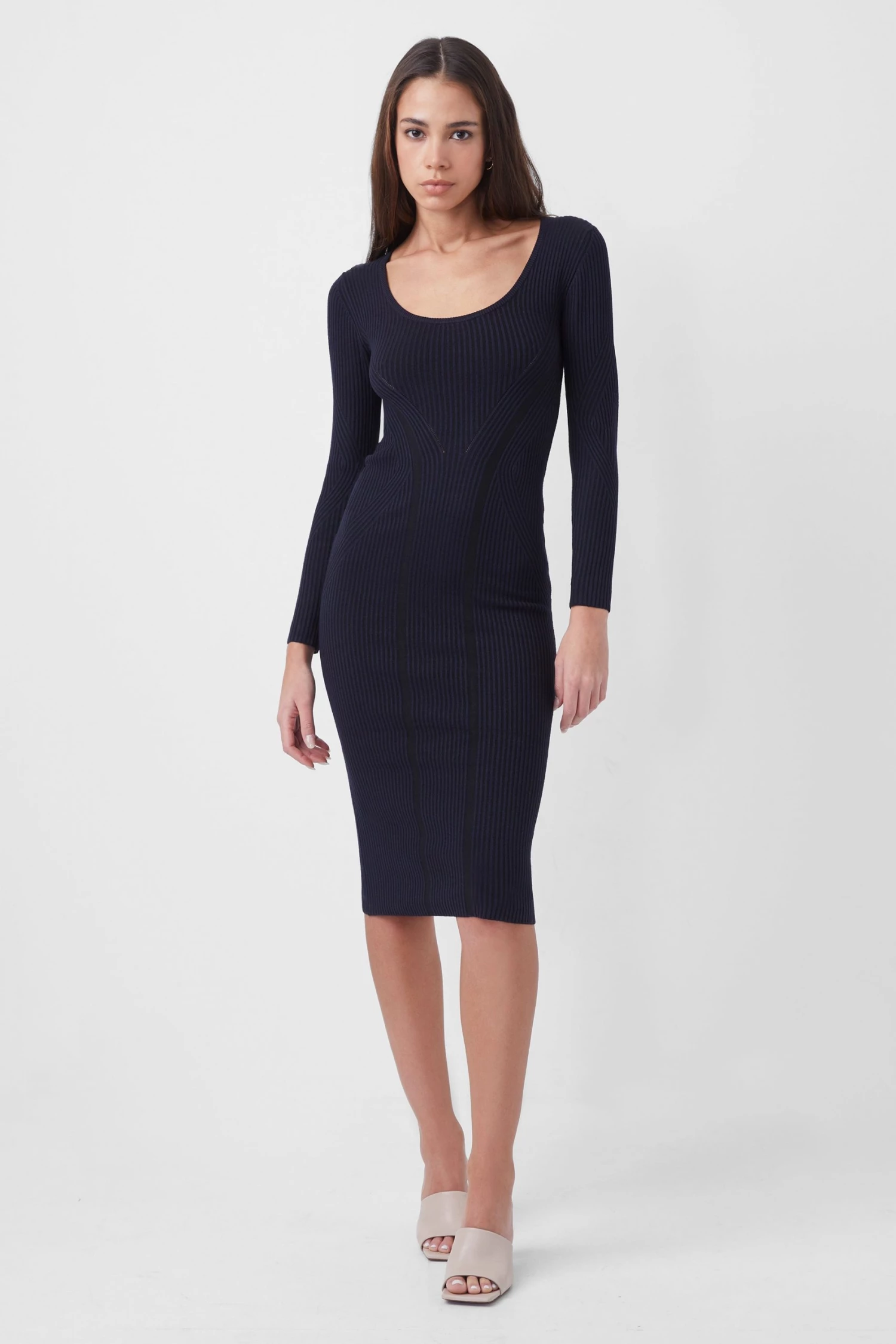 Channel a minimalist approach to dressing by slipping into the Simona Knit Scoop Neck Bodycon Dress. The body-skimming silhouette has a midi length and long sleeves.