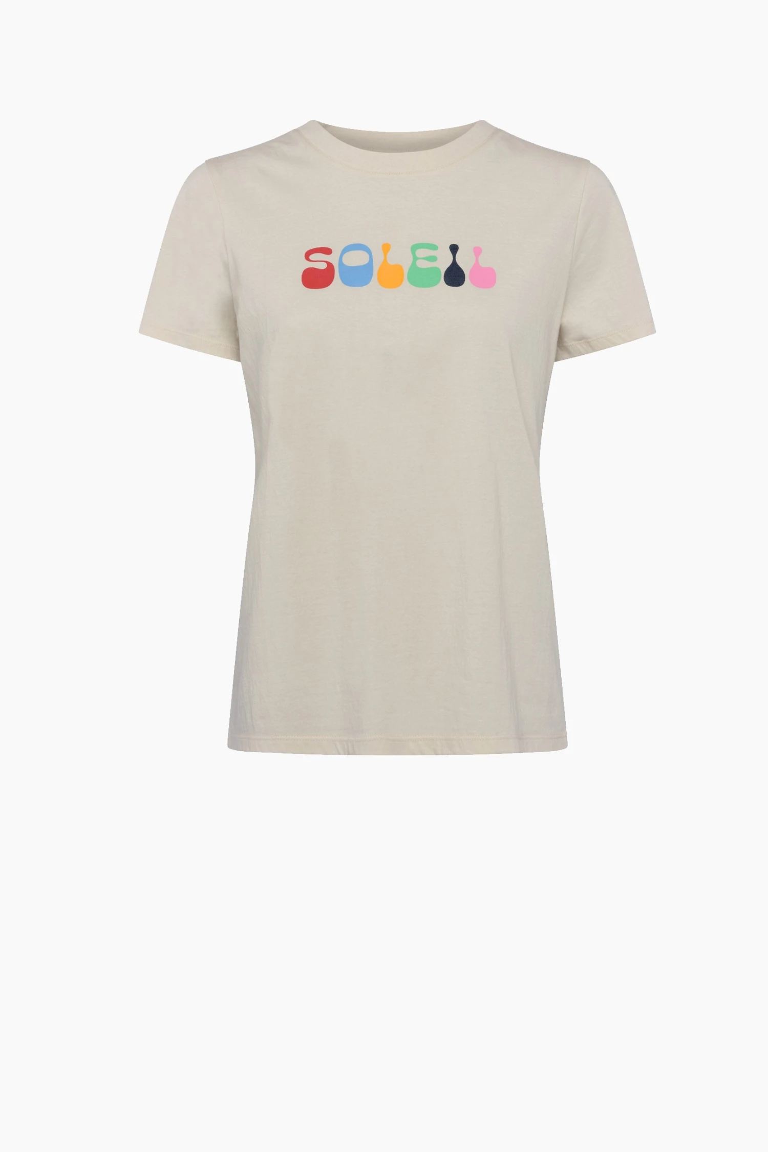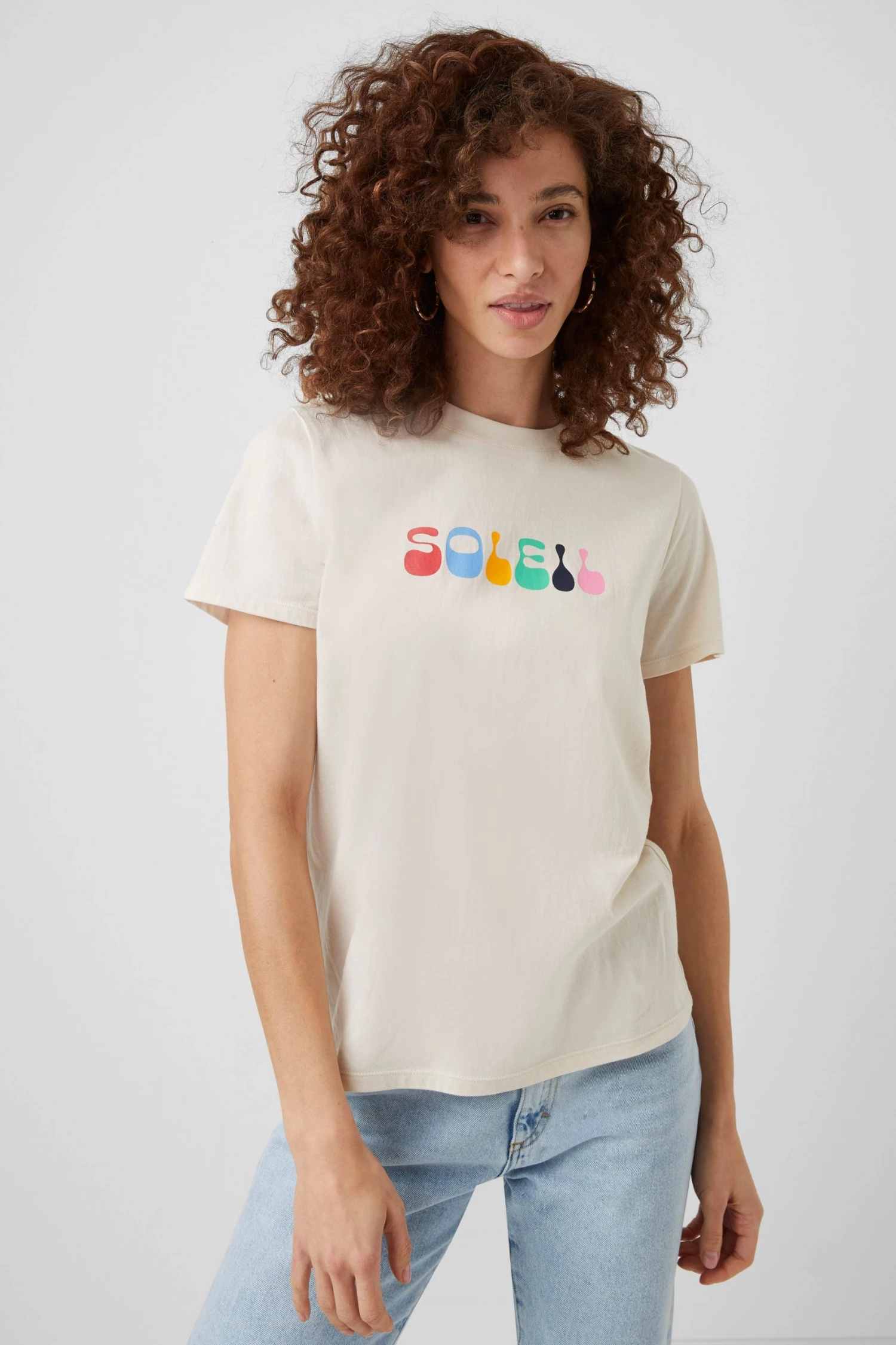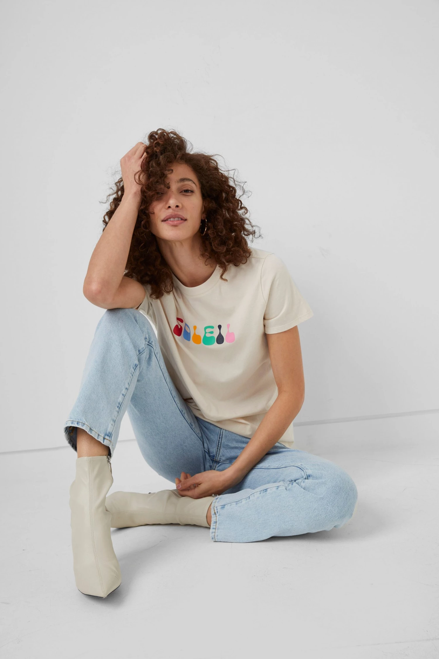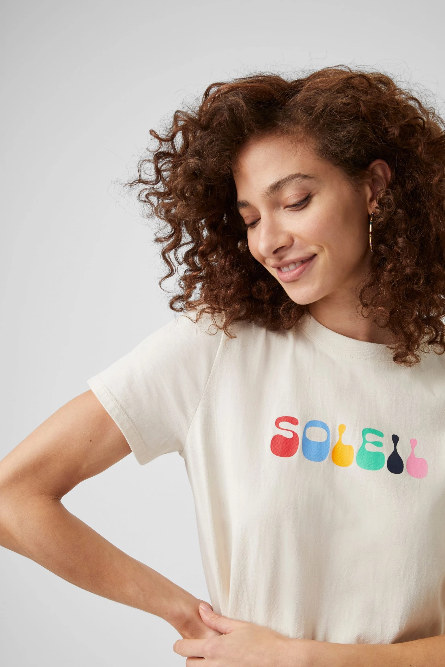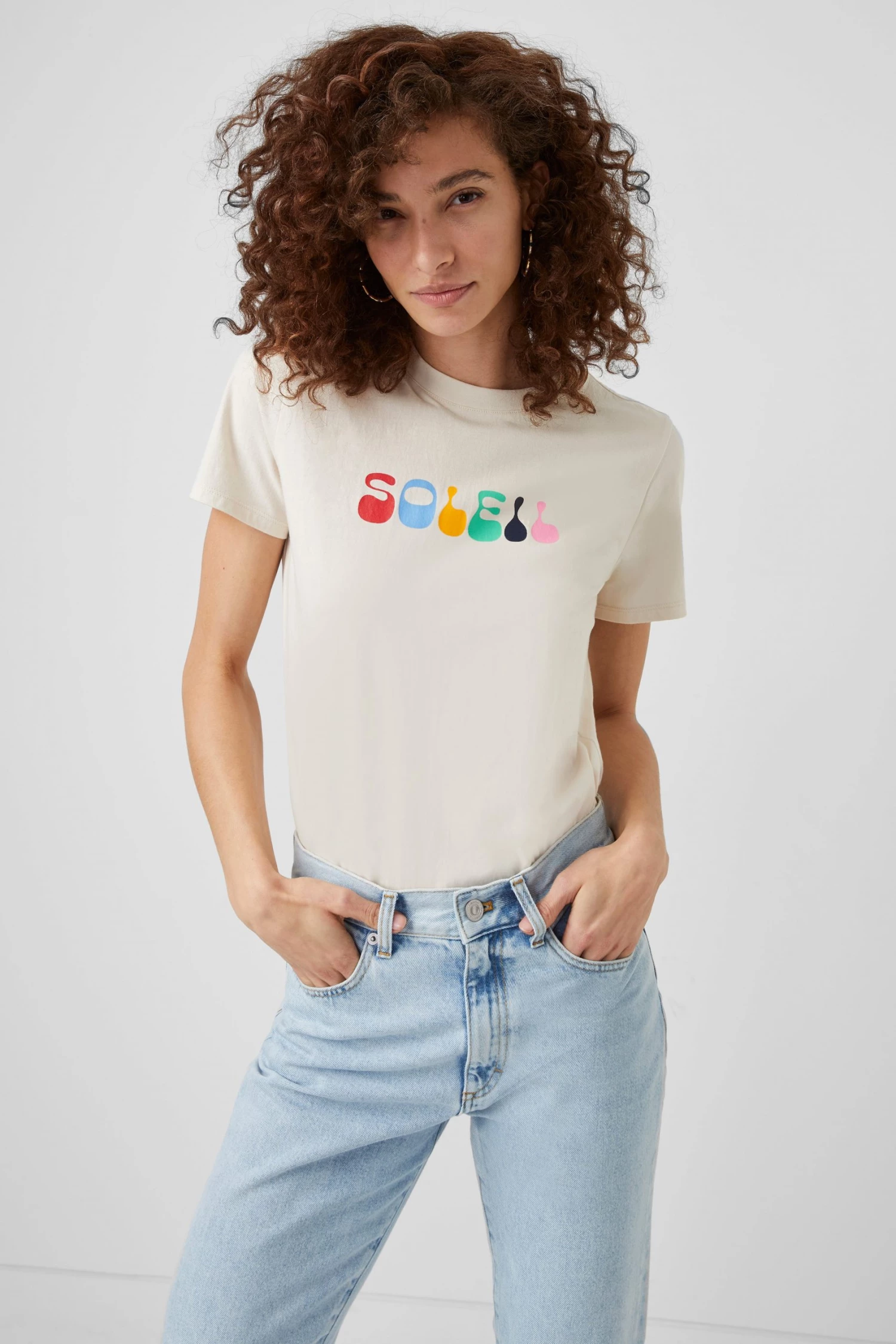 The Soleil Organic T-Shirt is your own reason to smile. The casual silhouette is printed with a colourful print spelling ‘Soleil’ which translates to sun.
