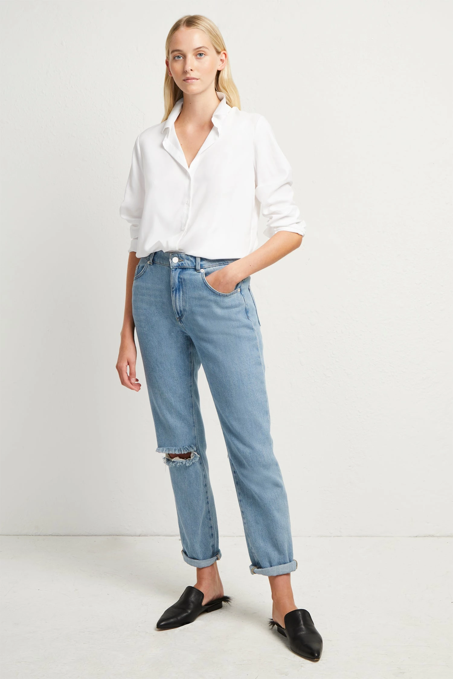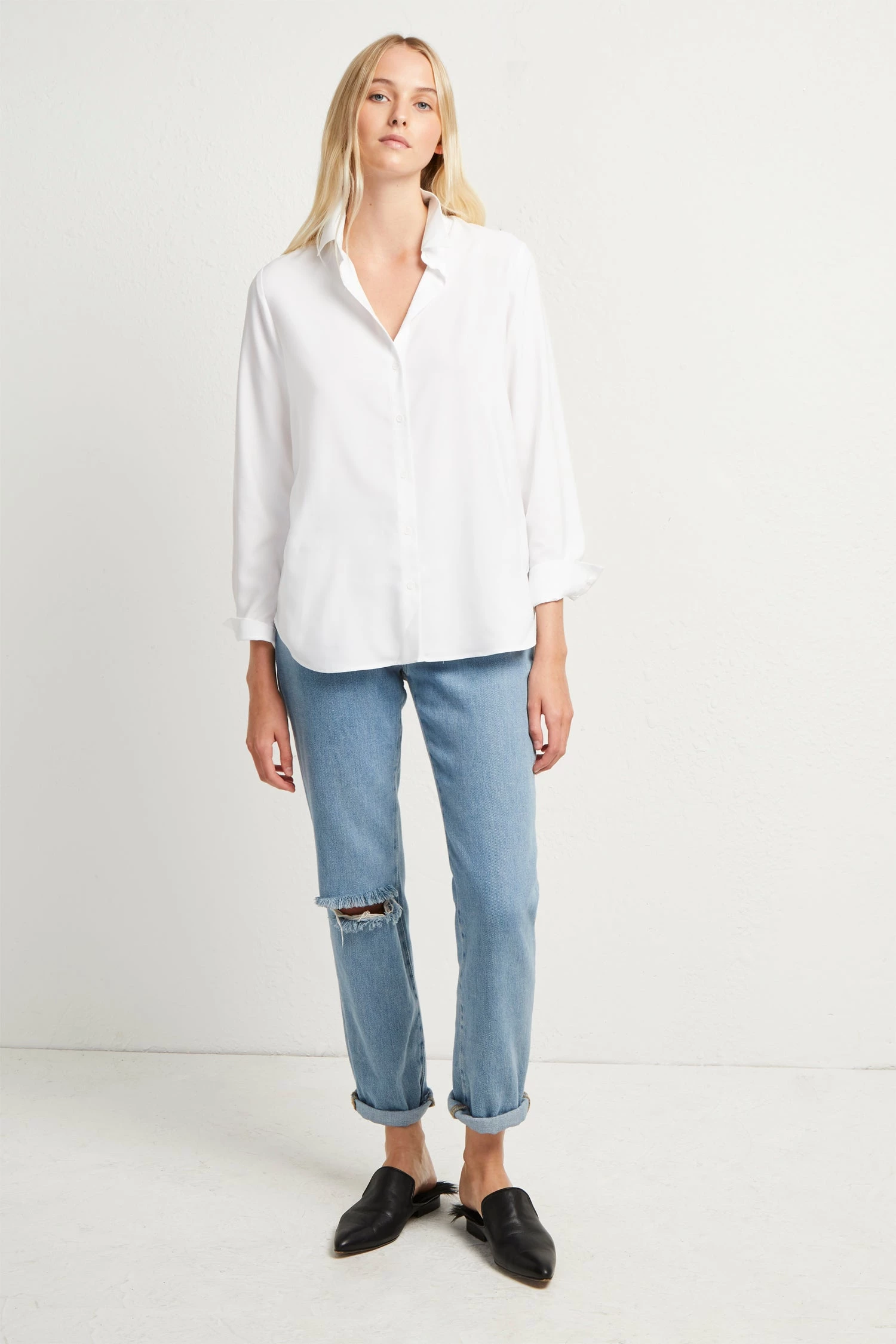 Update your 9 to 5 style with enduring favourites like the Crepe Light Silky Shirt. The button-up shirt has a simple silhouette, with long sleeves, a point collar and a form-skimming fit. With a silk-feel finish, the crisp white shirt is perfect for pairing with slim fit trousers or a pencil skirt.