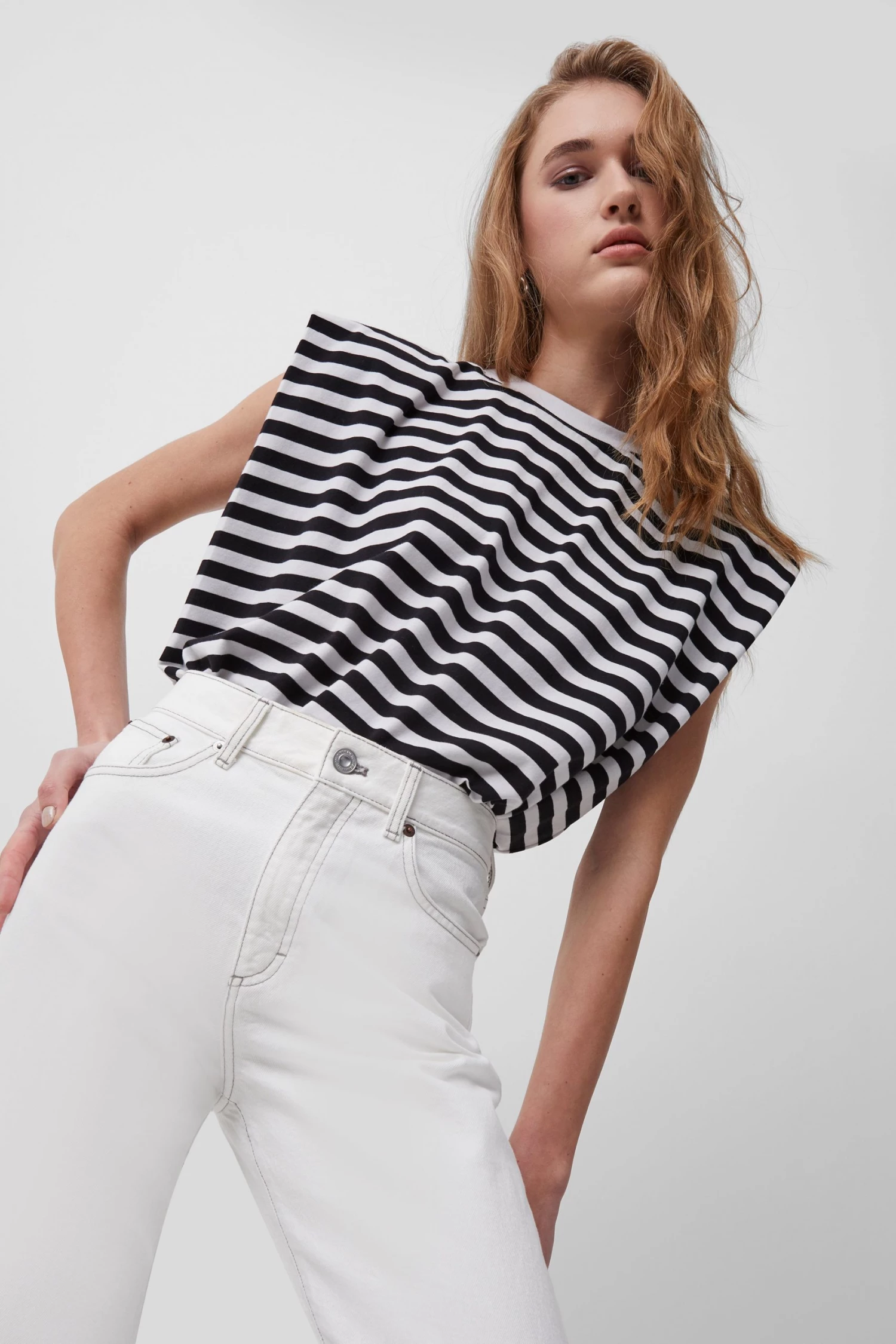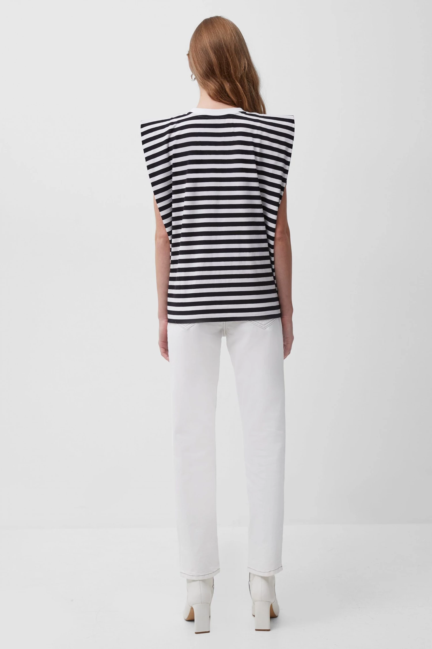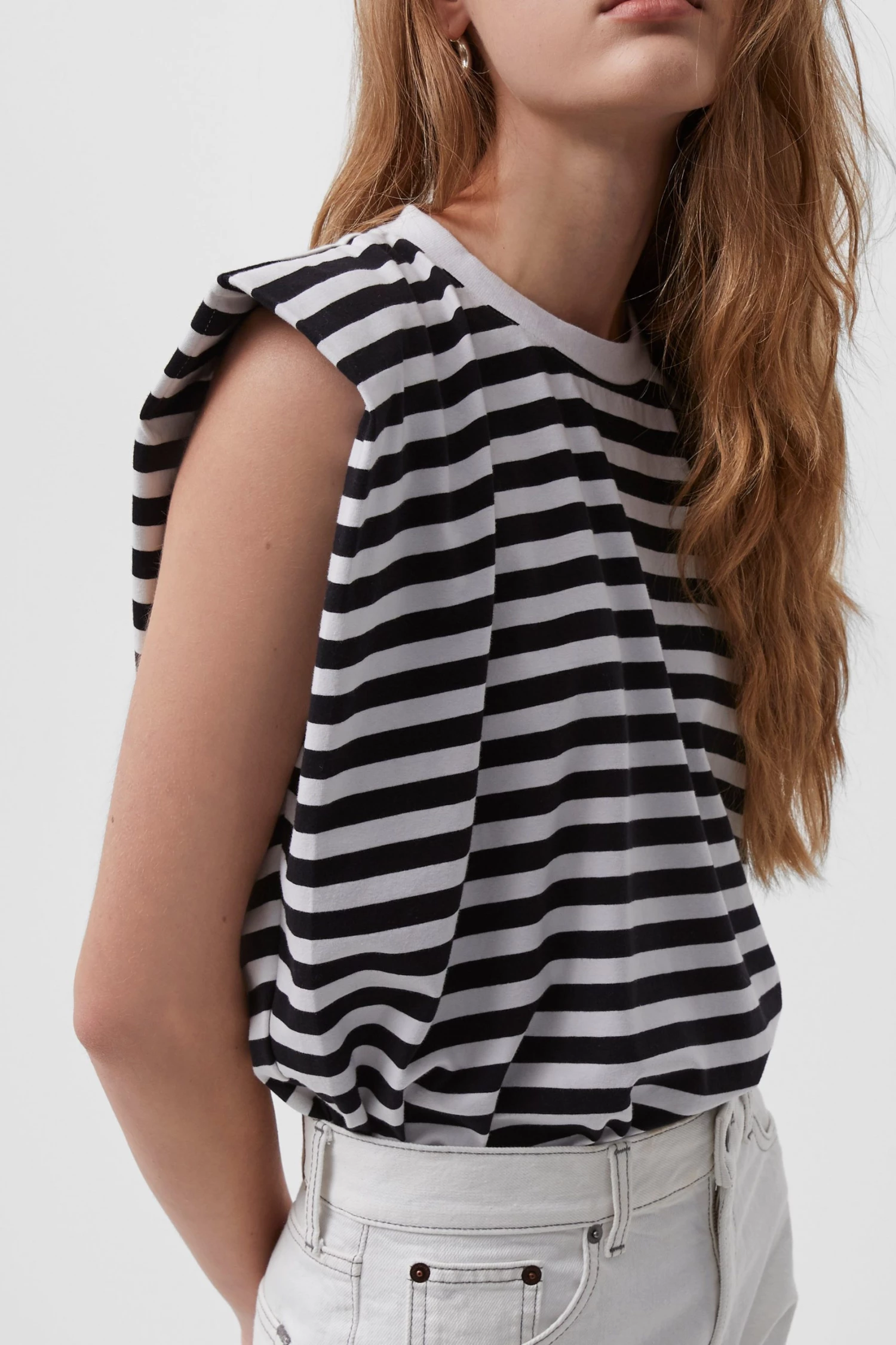 Classic nautical style meets a vintage aesthetic in the Shoulder Pad Stripe Tank Top. Created with a simple round neckline and scene-stealing shoulder pads.