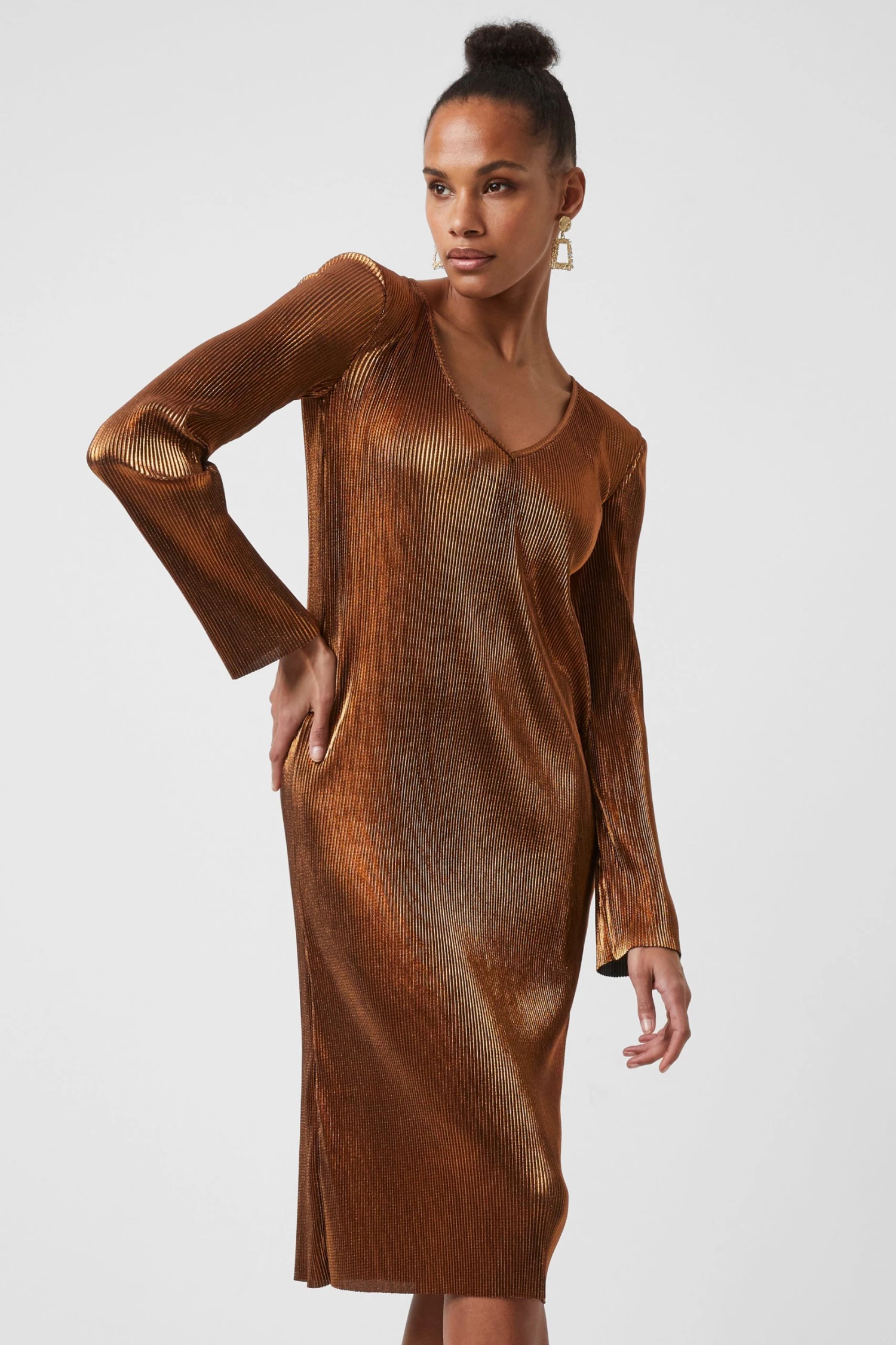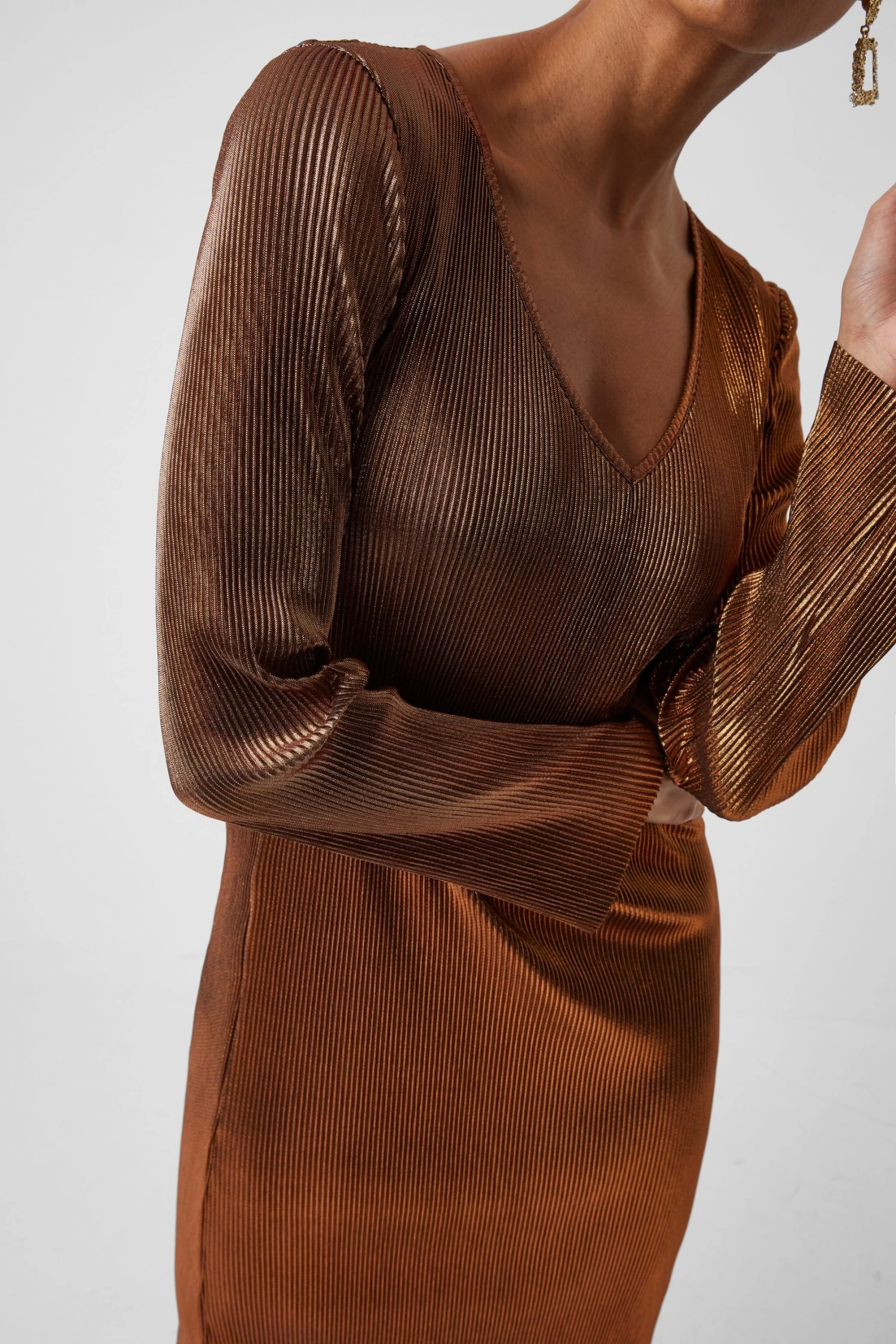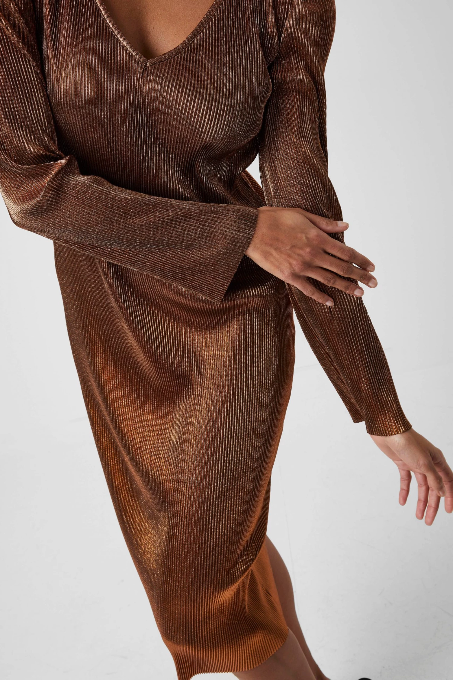 Your new BFF for the party season, our Taina Pleated Metallic Midi Dress is constructed from a ribbed fabric with a golden metallic sheen and midi length.