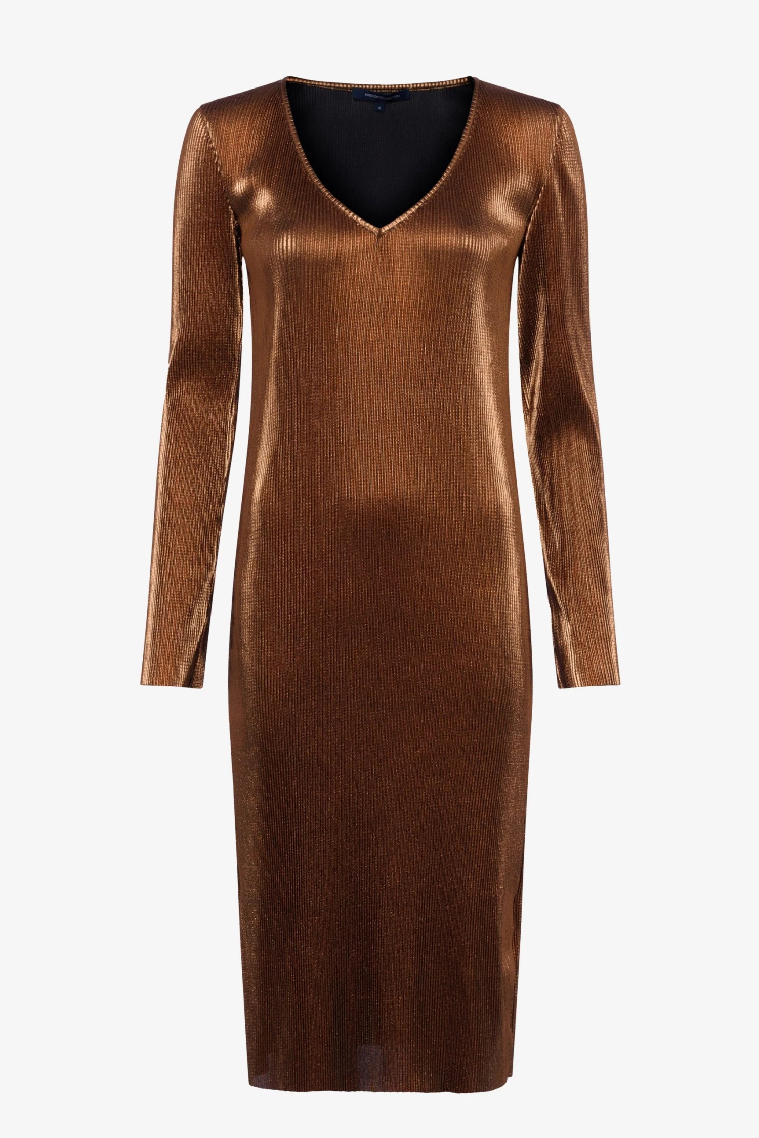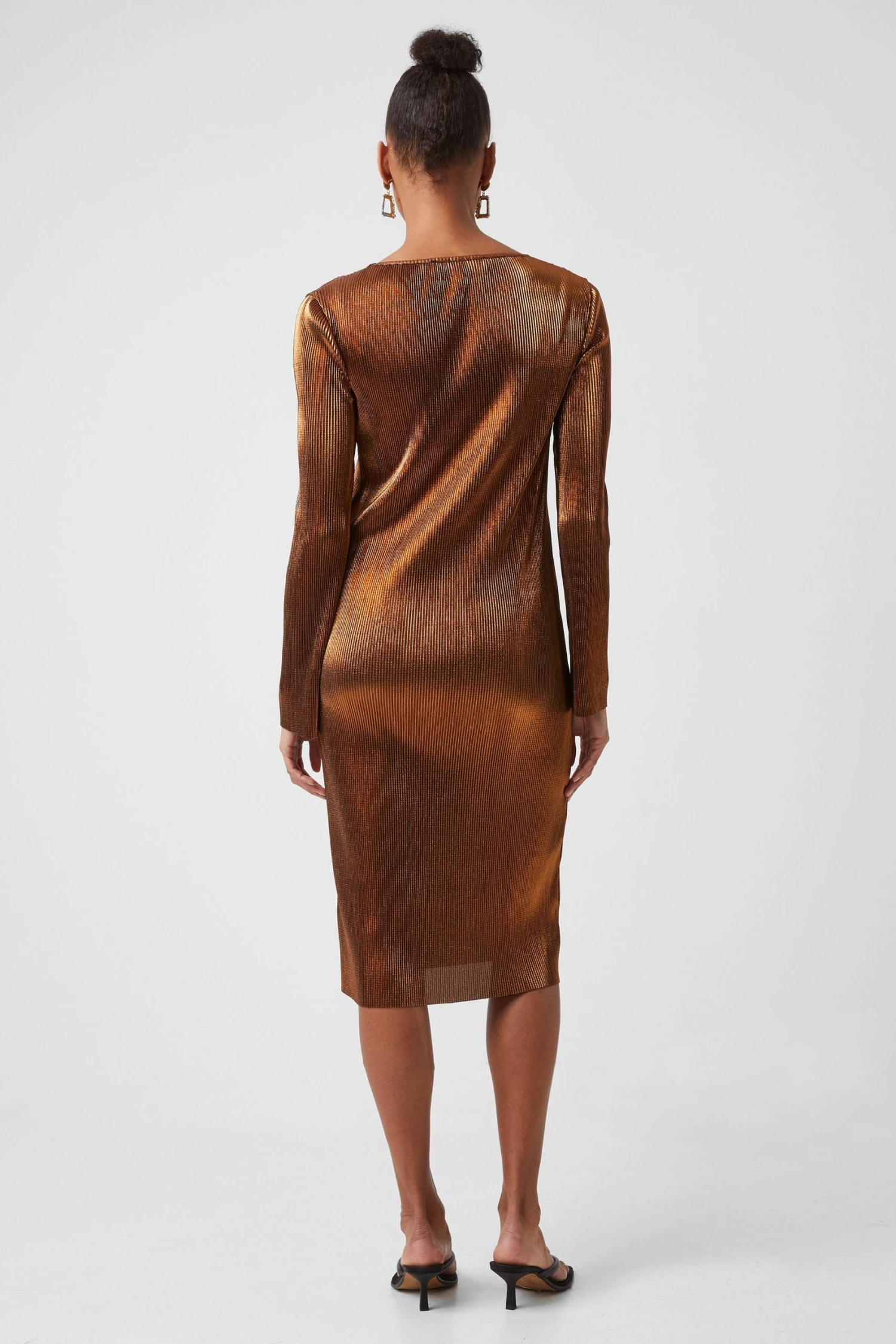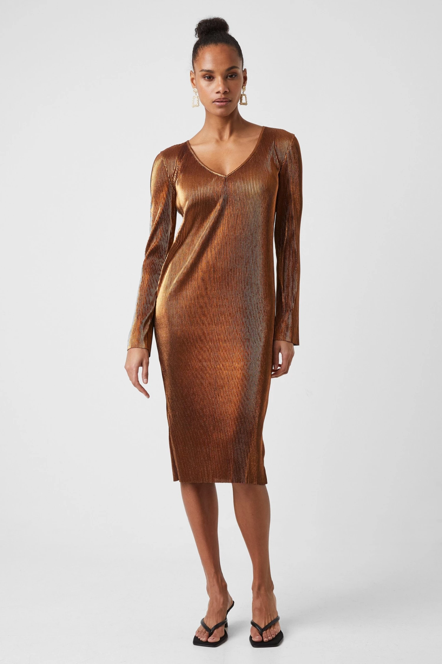 Your new BFF for the party season, our Taina Pleated Metallic Midi Dress is constructed from a ribbed fabric with a golden metallic sheen and midi length.