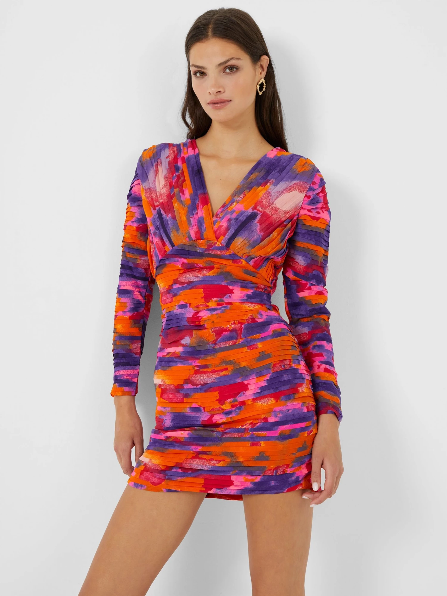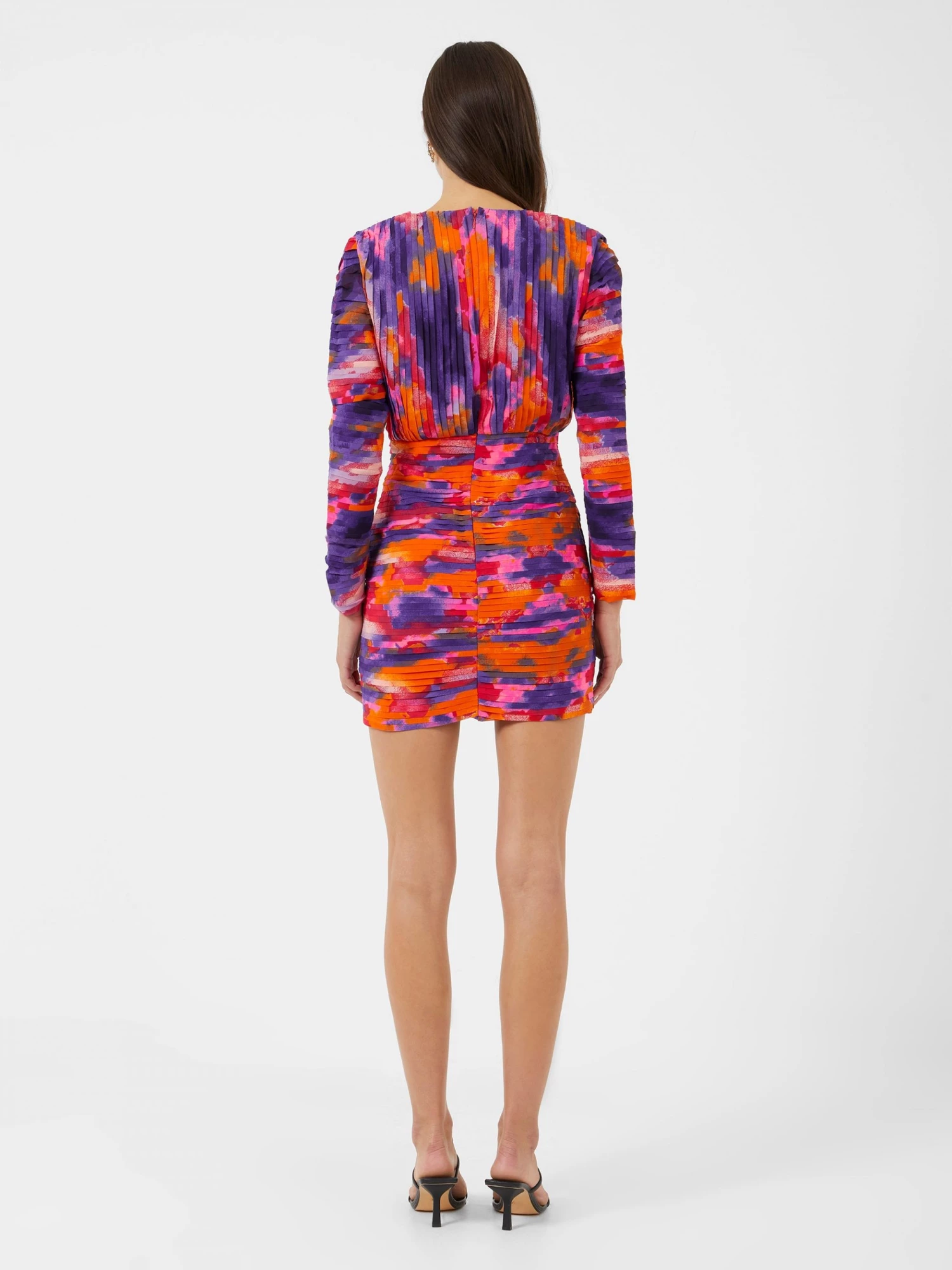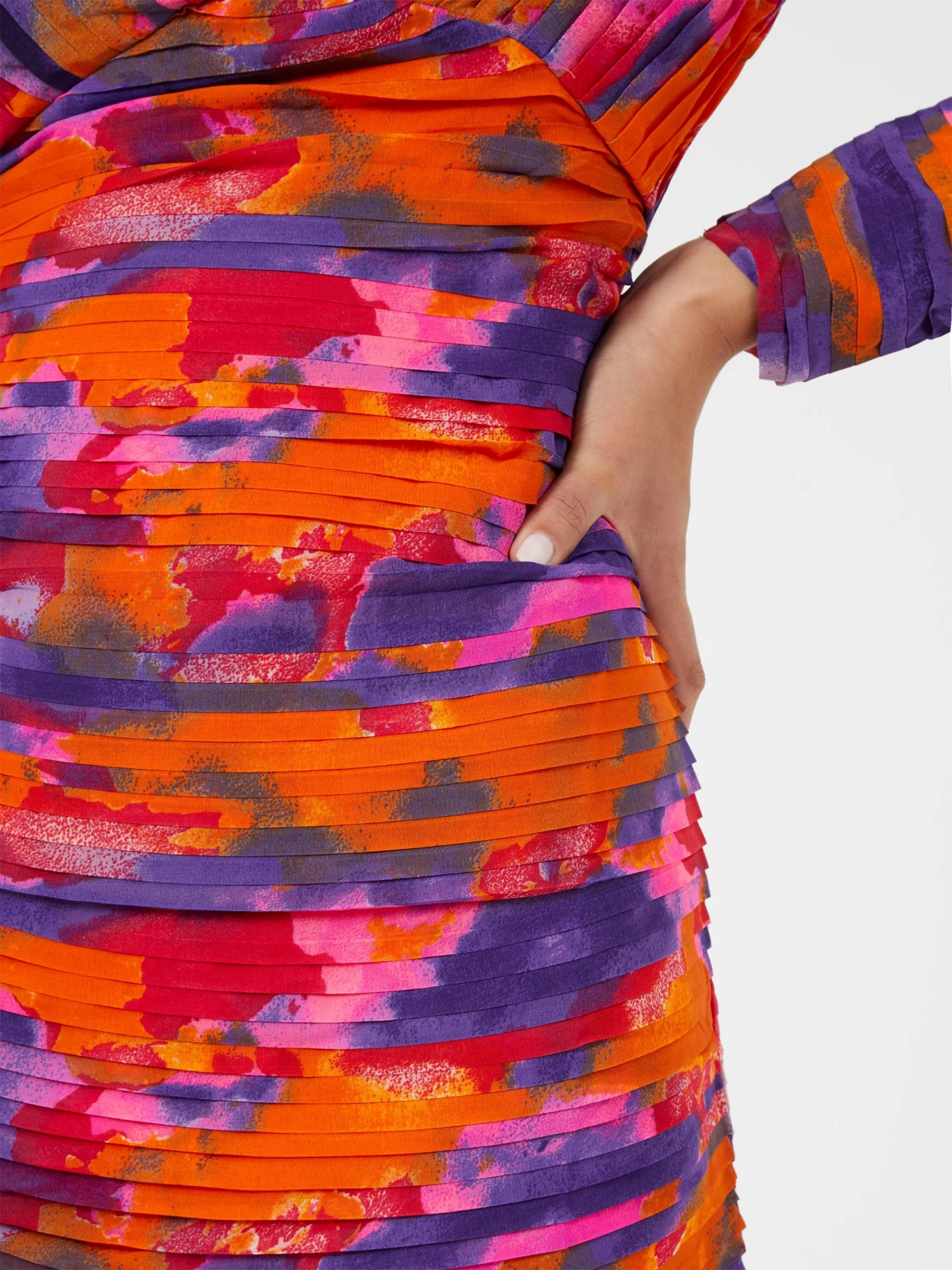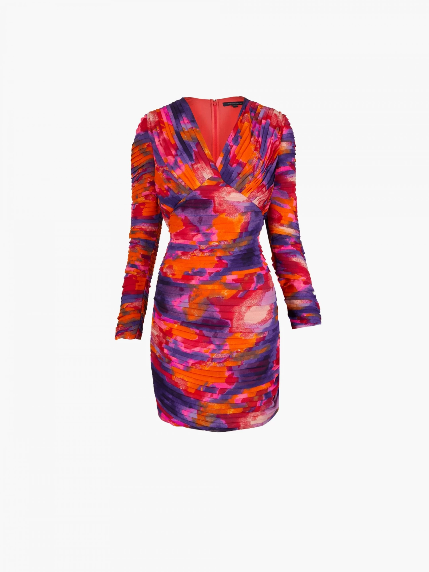 A bold bodycon, the Watercolour Long Sleeve Bodycon Mini Dress is a spotlight stealer for every occasion. Sunset hues of orange, pink and purple depict a whimsical watercolour scene upon the long sleeved and miniature length silhouette of this dress, bursting into life with unique pintuck pleats and a v-neckline.