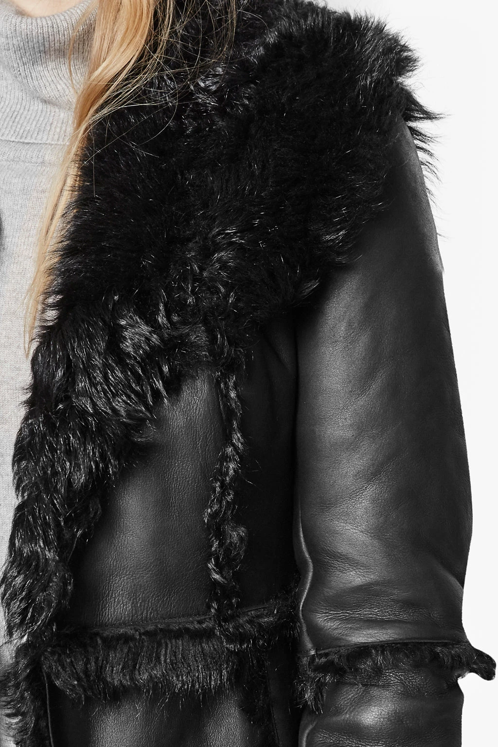 - Wide sheepskin-lined lapels reaching over shoulders