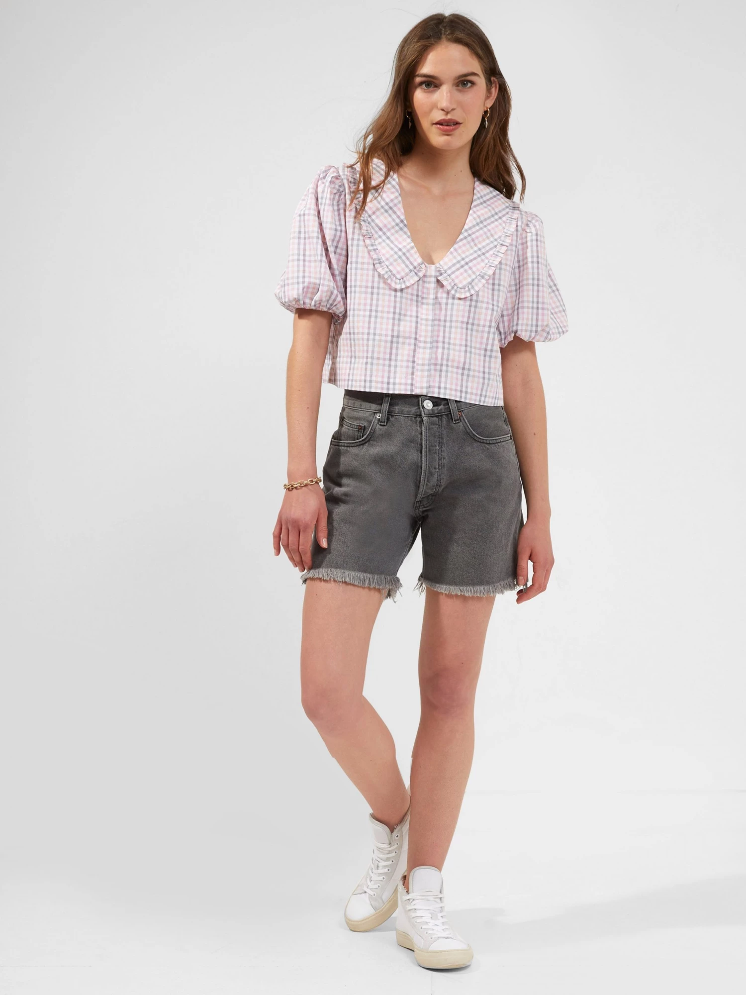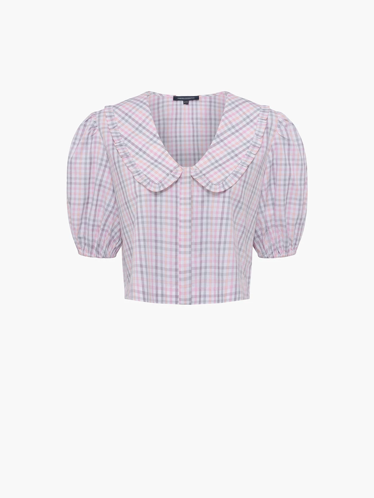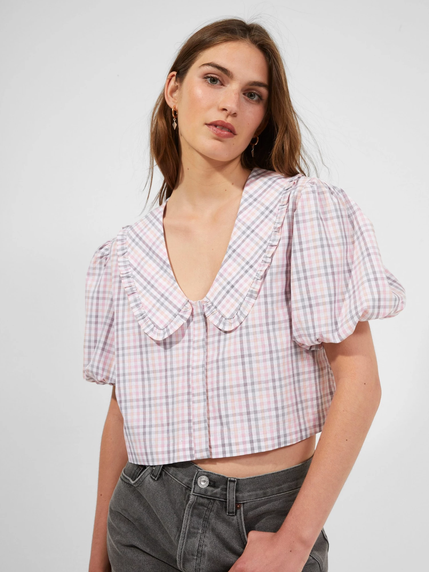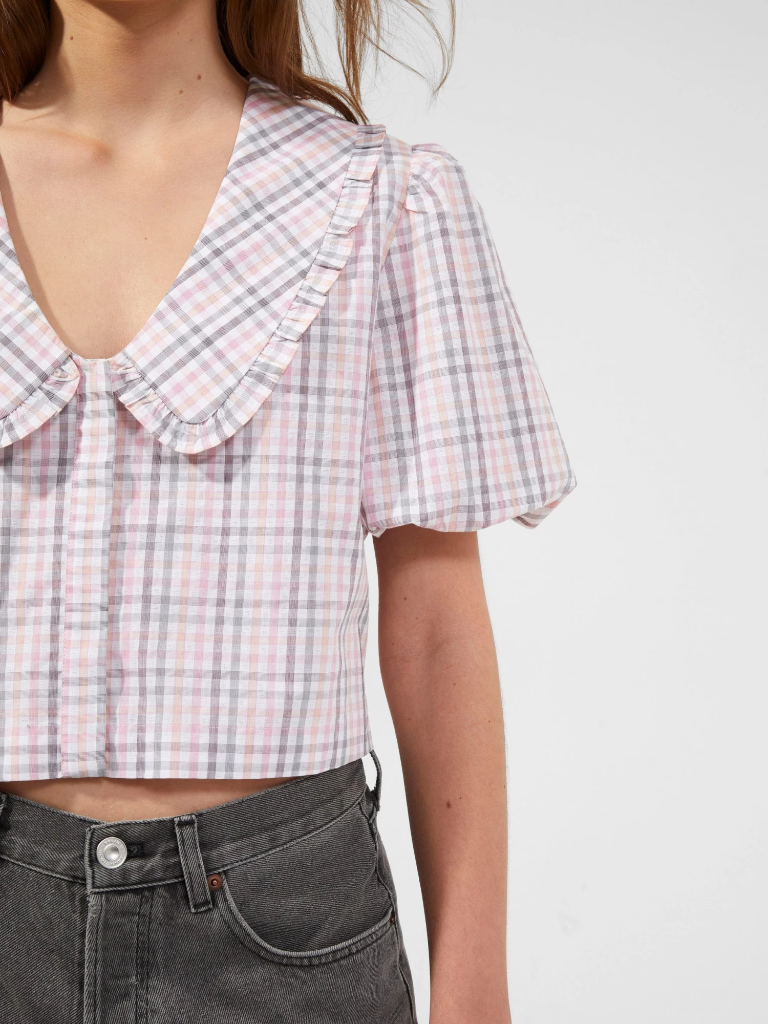 The Yaki Organic Check Blouse will take you from work to dinner. Its crisp cotton silhouette spotlights a gingham print and Peter Pan collar.