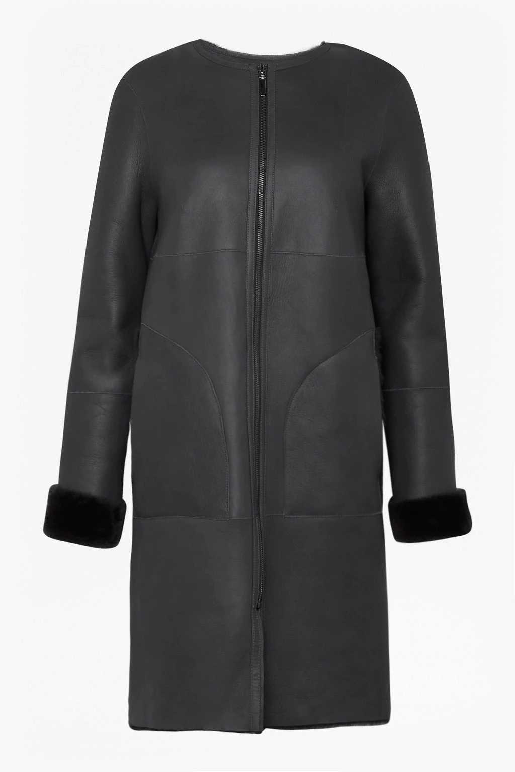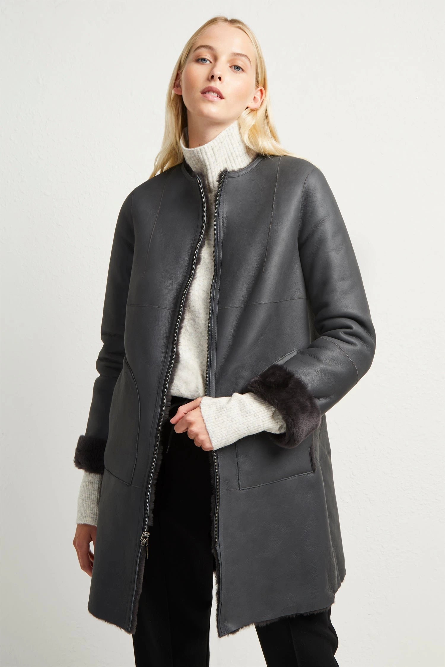 Arm yourself through the colder months with the Zelda Shearling Zip Reversible Coat. The Zelda is expertly crafted in supple leather on one side, which provides a smooth, sleek finish. A shearling lining offers luxuriant comfort on the reverse, and can be worn on display for glamorous evening outerwear. With a collarless neckline, longline shape and a subtle zip which makes for for a clean silhouette and almost uninterrupted texture. Roll the cuffs to reveal a shearling trim when showing off the soft leather. Offering both style and warmth, the Zelda can be worn over jeans and your favourite knitwear for winter cosiness, or as a tactile finish to your evening wear.